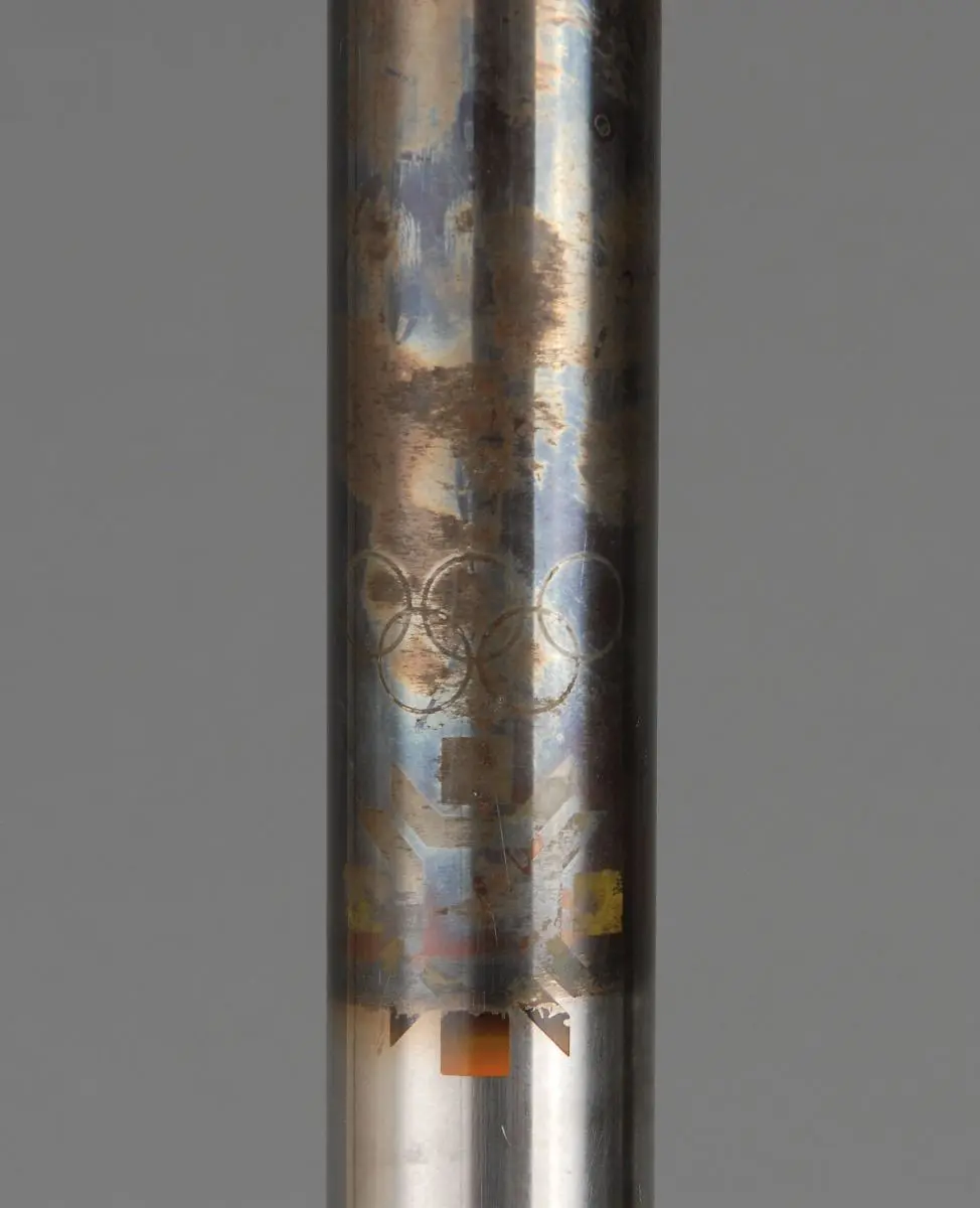 Detalj metalnog tijela baklje pokazuje završnu obradu gornjeg dijela i tragove korištenja oko ugraviranih olimpijskih simbola.