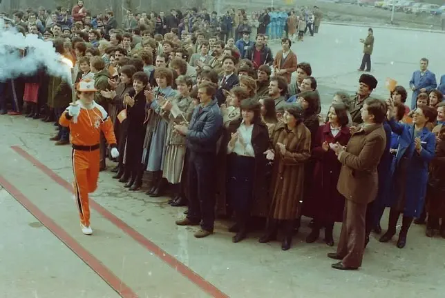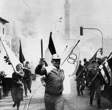 Novinska fotografija iz perioda prikazuje štafetu kako prolazi gradskom ulicom.