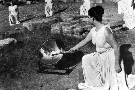Crno-bijela novinska fotografija bilježi ritual paljenja u Olimpiji iz tadašnje štampe.