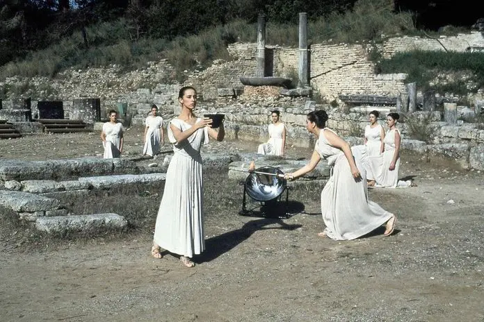 Ceremonija paljenja u Olimpiji prikazuje svečani trenutak prije prijenosa plamena u Jugoslaviju.