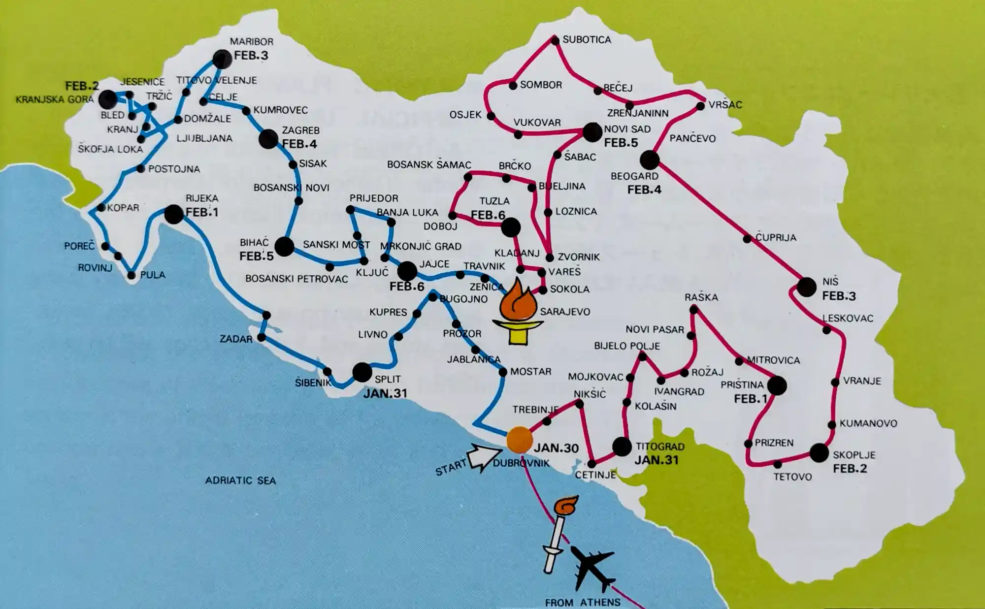 Podjelom plamena na dva toka, istočni i zapadni, štafeta iz 1984. osmišljena je tako da obuhvati svaki kraj Jugoslavije, pretvarajući put dug 5.000 kilometara u jedinstvenu demonstraciju mira i logističke preciznosti.