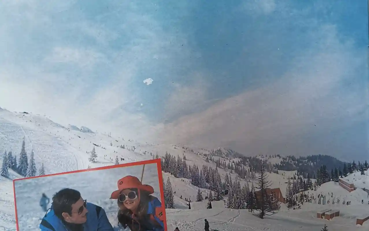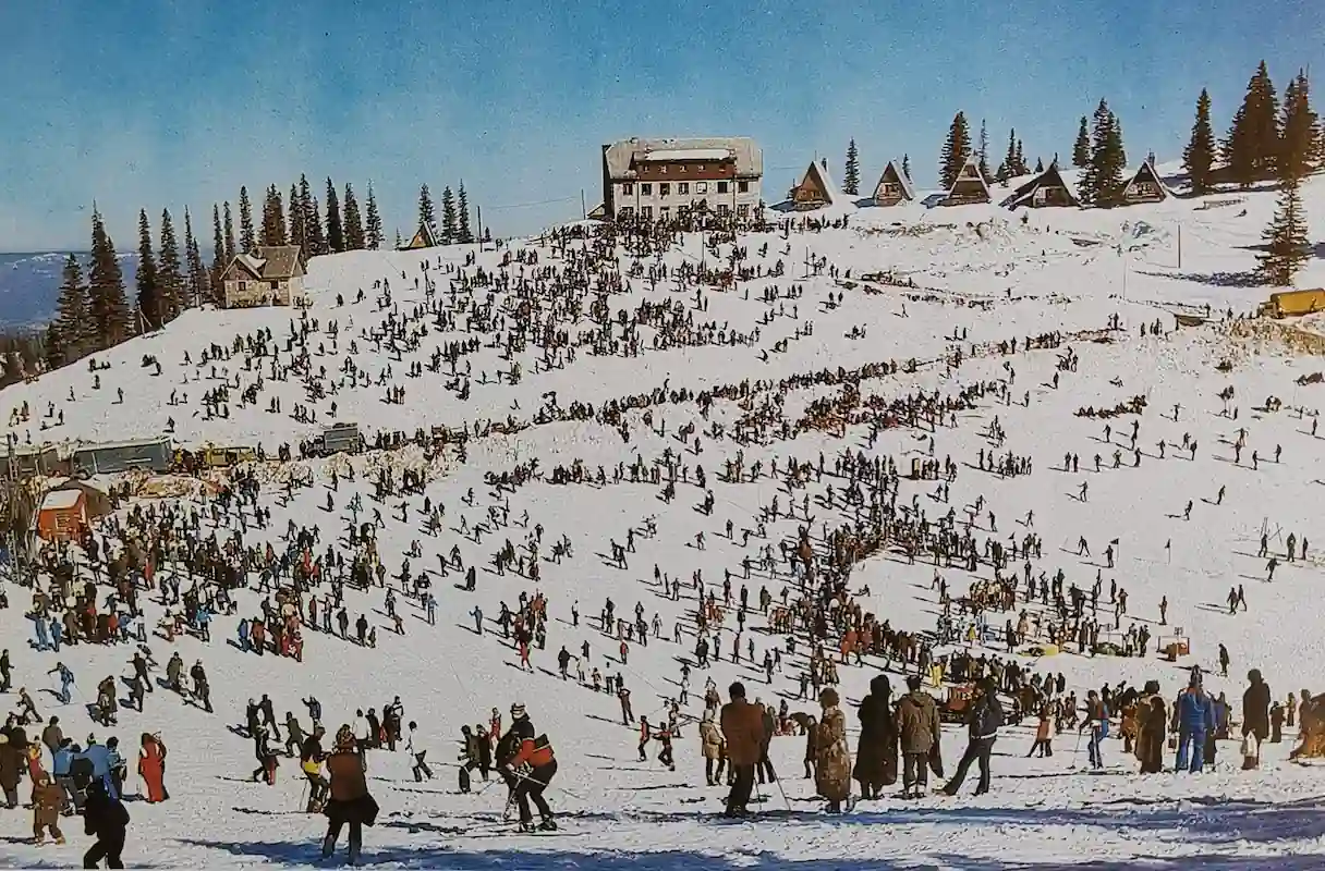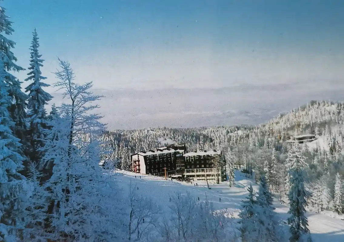 Ovaj visokozimski prizor prikazuje hotele i jezgro naselja u zoni Bistrice tokom olimpijskog perioda.