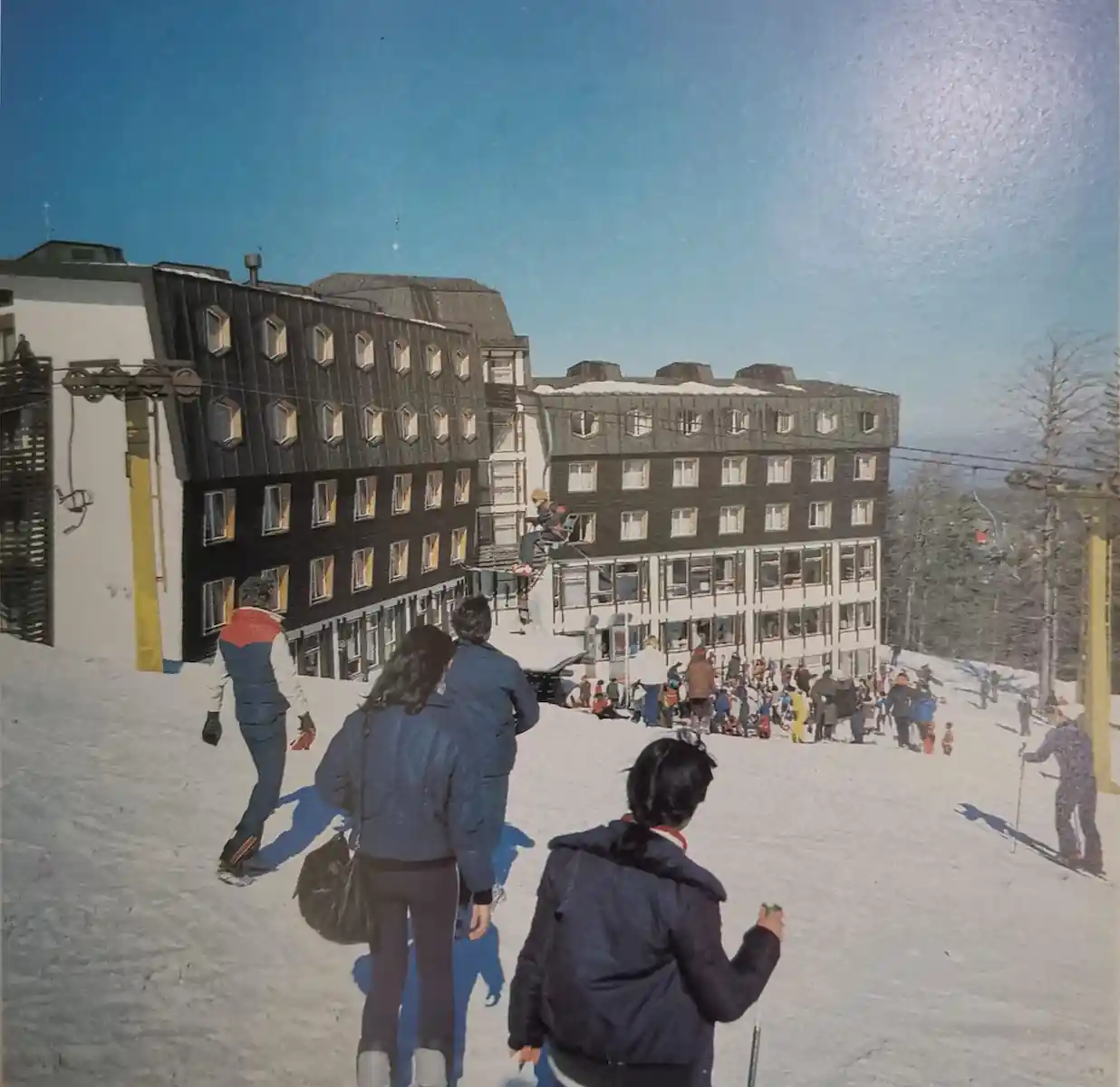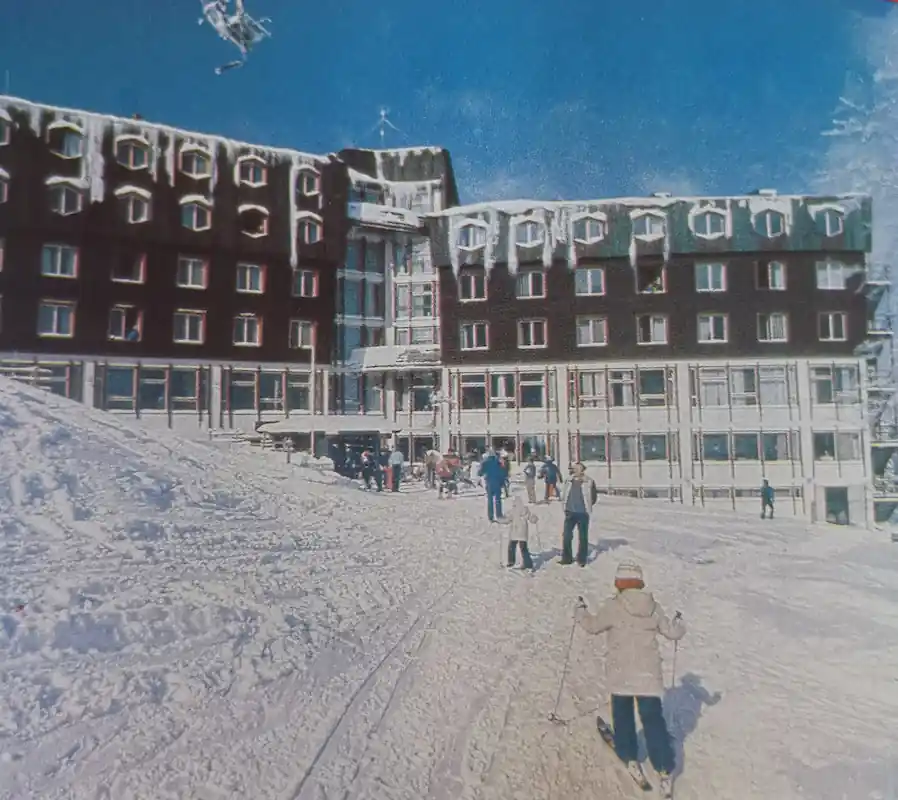 Pročelje hotela Jahorina prikazano je sa zastavama i gustim pješačkim prometom tokom 1980-ih.