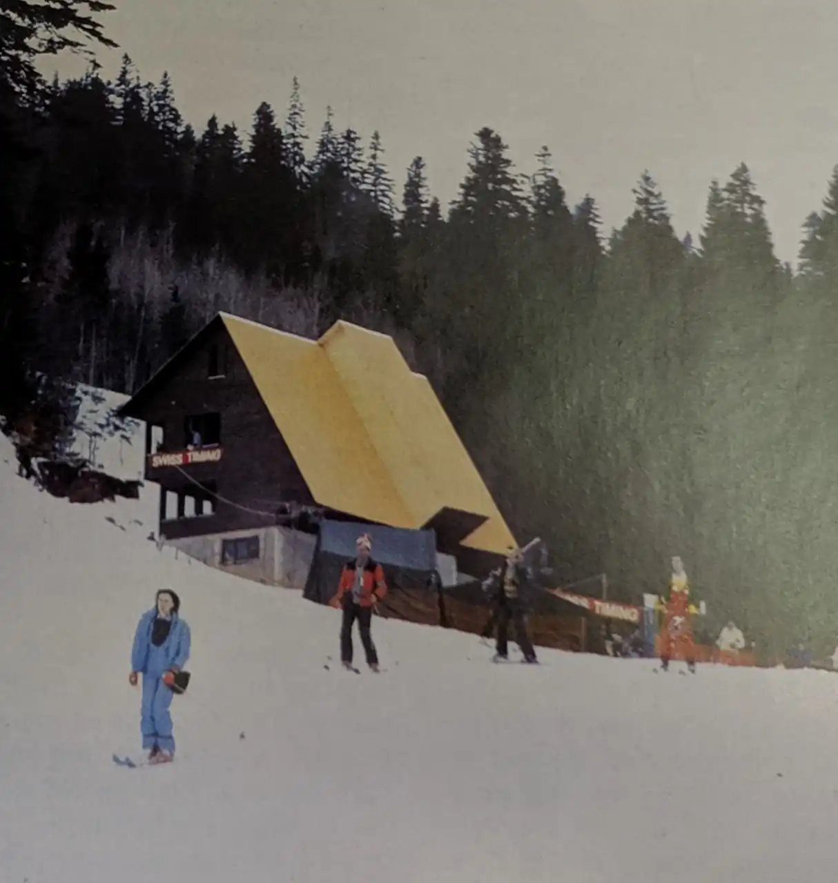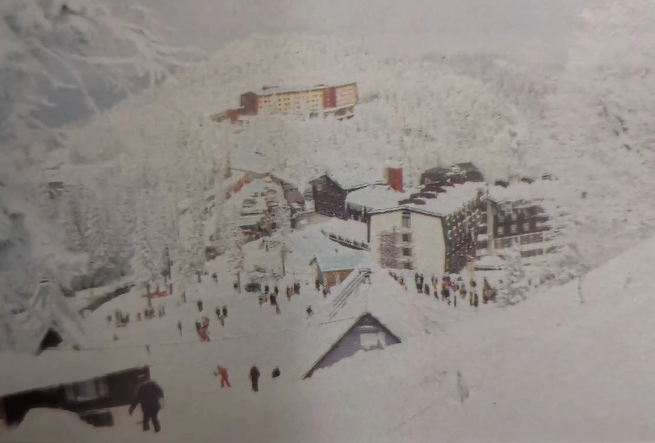 Ovaj razglednički pogled kadrira hotelski kompleks dok se skijaši kreću kroz baznu komunikacijsku zonu.