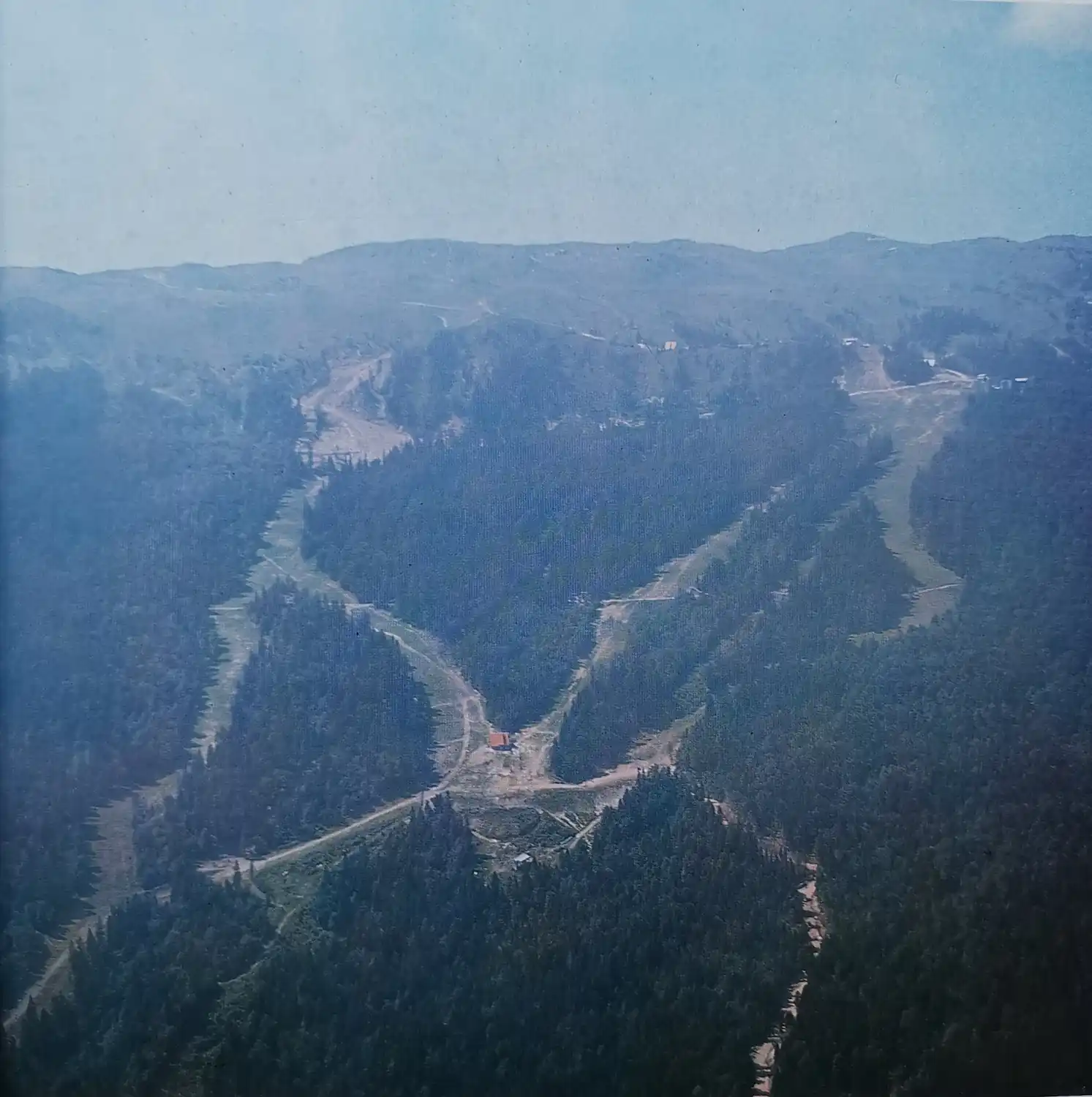 Zračni ljetni pogled prikazuje široku lepezu jahorinskih staza koje se spuštaju s grebena Ogorjelice.