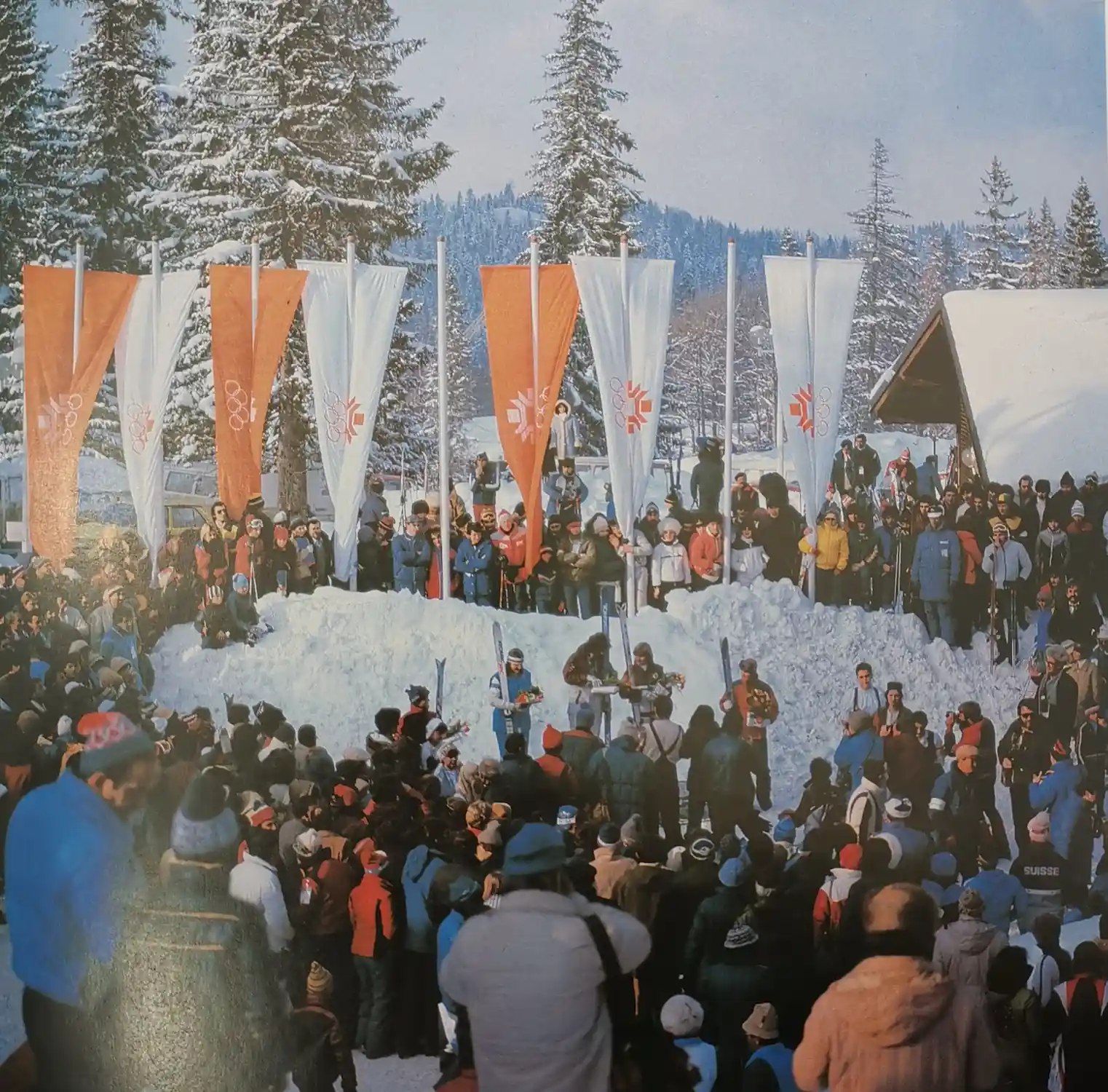 Velika masa ljudi pod olimpijskim zastavama okupila se na ceremoniji dodjele medalja na planini.