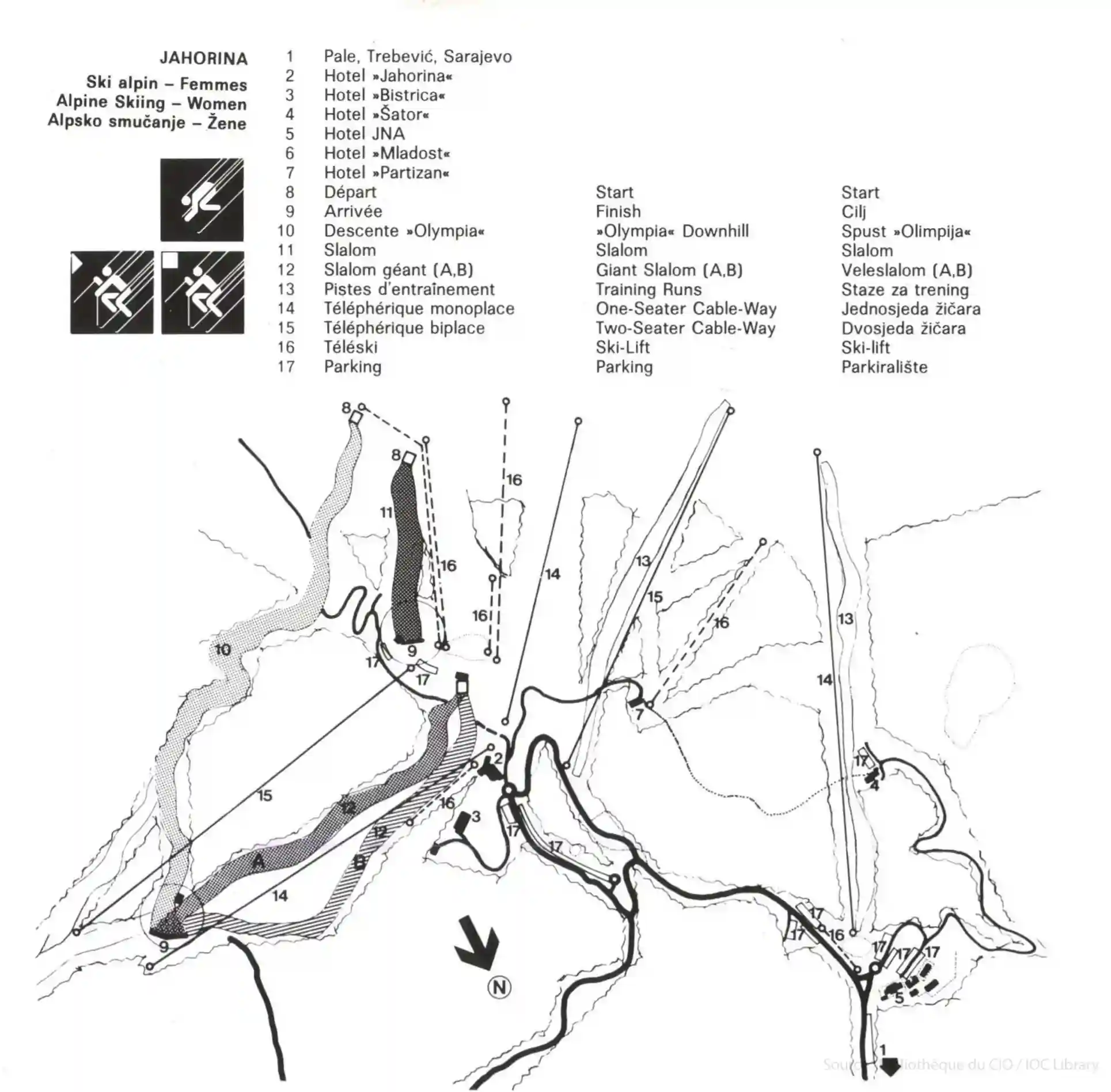 Borilište karakterizira "široka lepeza" prirodnih otvorenih padina pri vrhu, koje se zatim spuštaju kroz četinarske šume u uže, tehnički zahtjevnije staze. Za Igre 1984. prostor je pripremljen za ženski alpski program, s ciljnom zonom na Kadinom Vrelu (1.326 m).