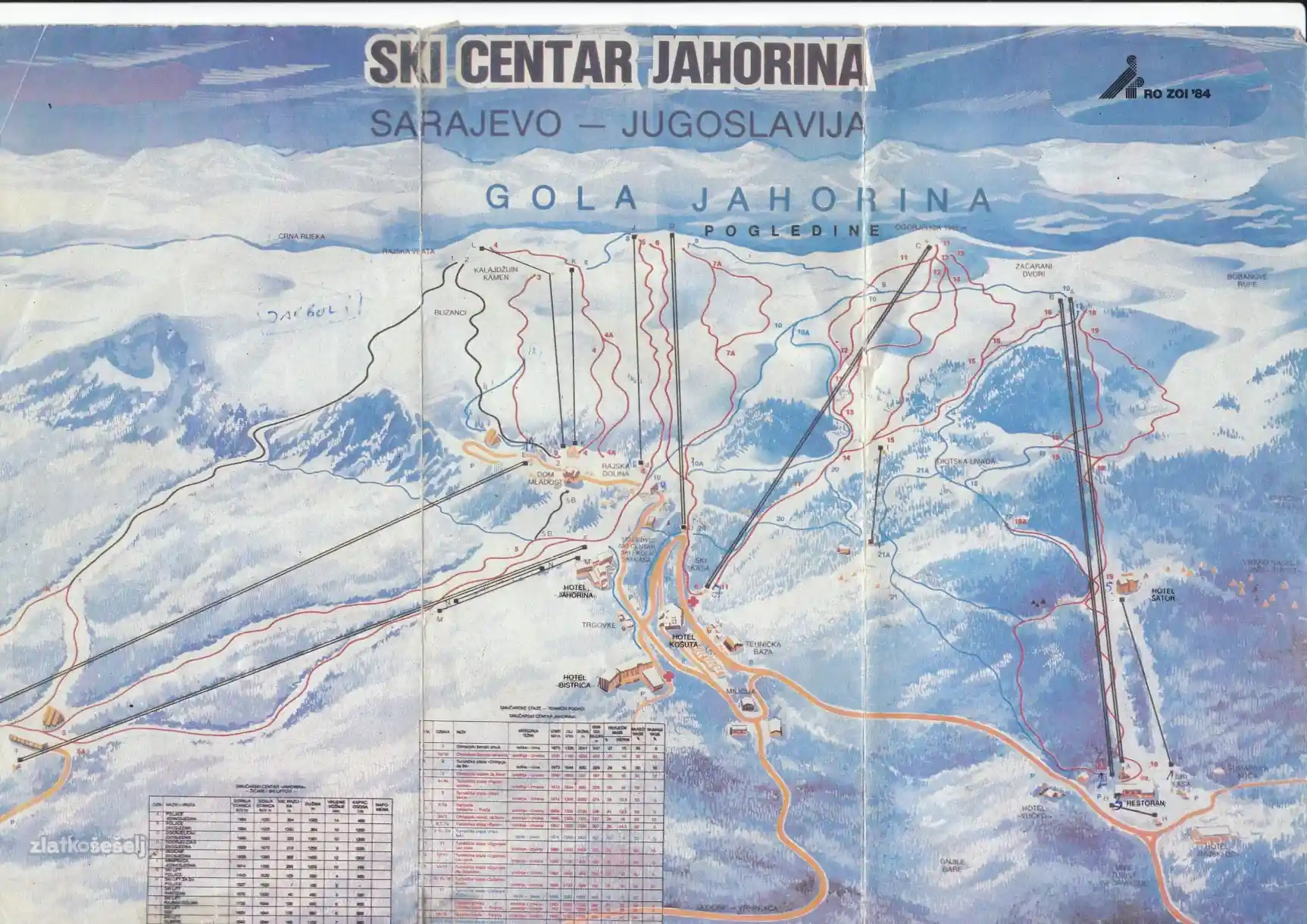 Historijska karta ski-centra prikazuje mrežu staza i žičara na Jahorini oko Gole Jahorine.