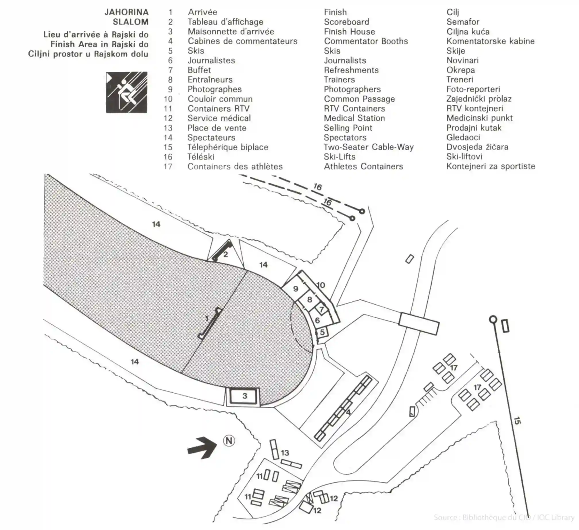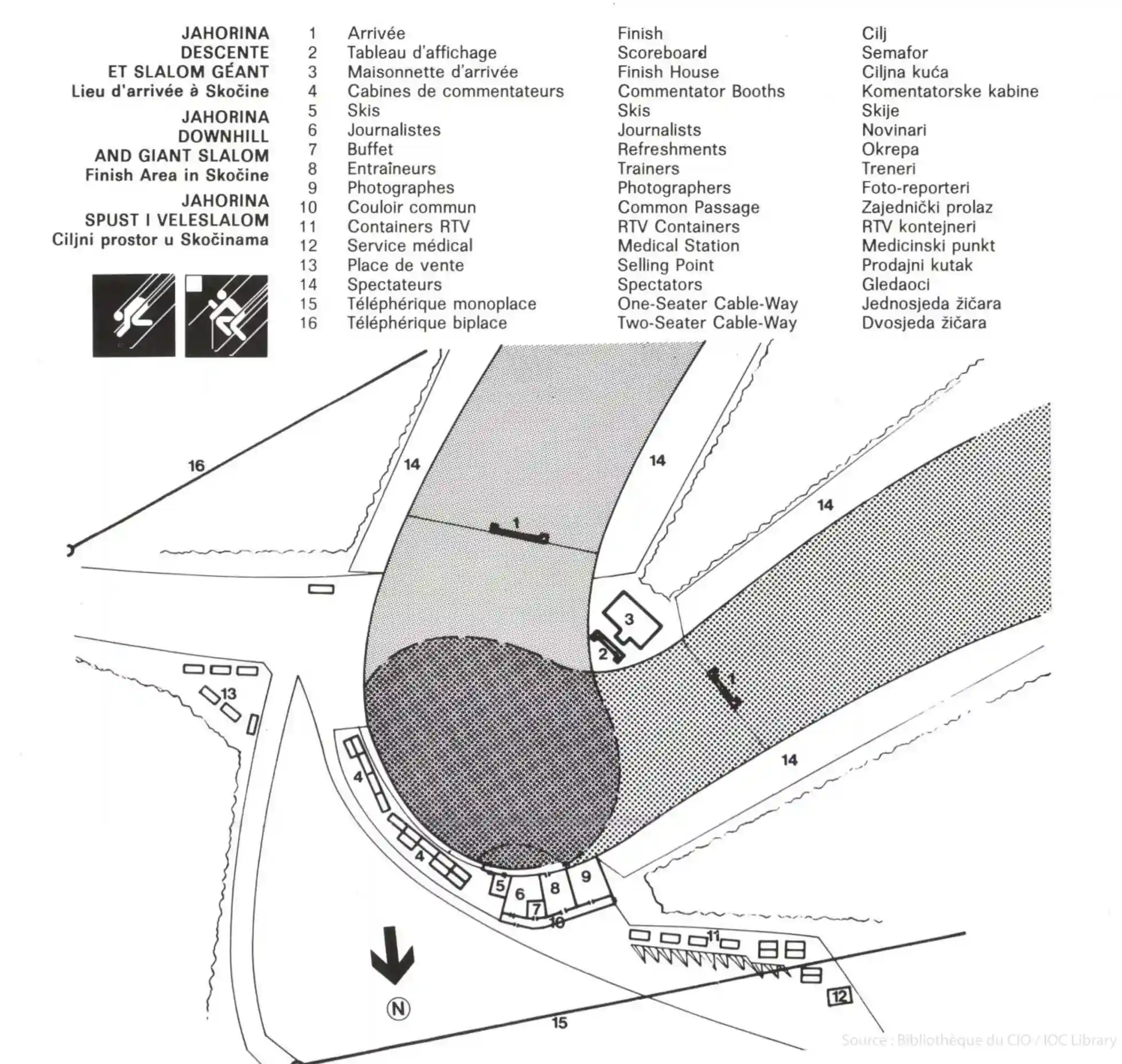 Ovaj dijagram iz olimpijskog doba prikazuje startne zone, ciljne prostore i servisne pristupne pravce.