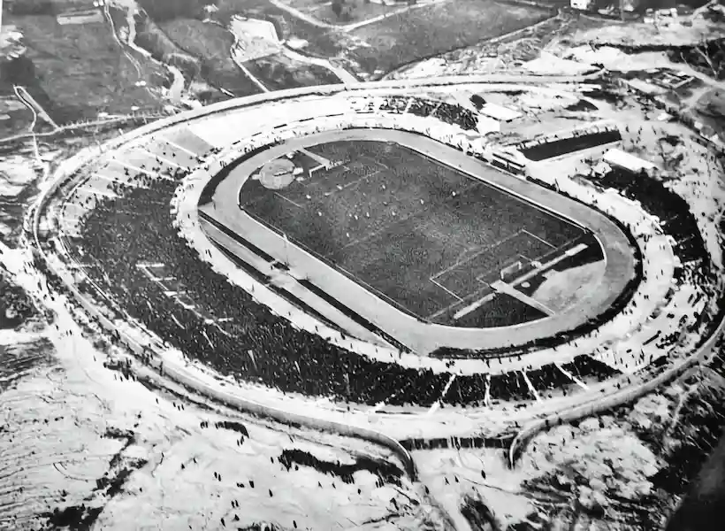 Ovaj poslijeratni pogled nakon obnove prikazuje dovršeni stadion sa moderniziranim tribinama i atletskom stazom.