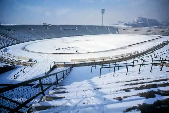 Zimski kadar uoči Igara prikazuje stadion pod snijegom dok se približava olimpijska sezona.