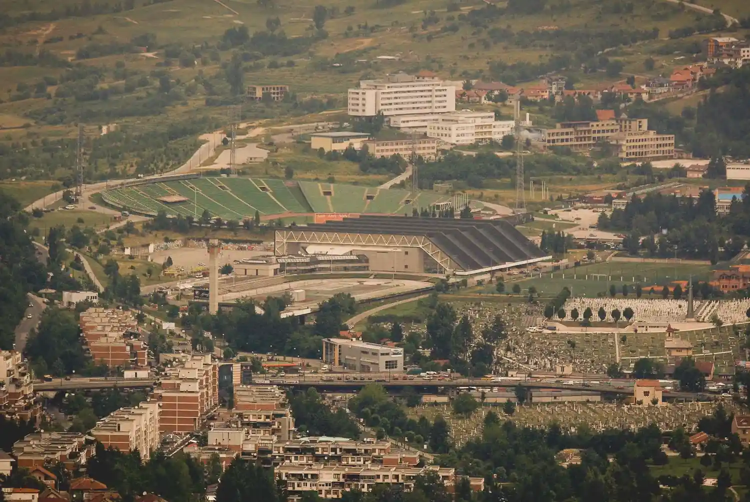 Savremena zračna perspektiva smješta Koševo u širi sjeverni sportski pojas Sarajeva.