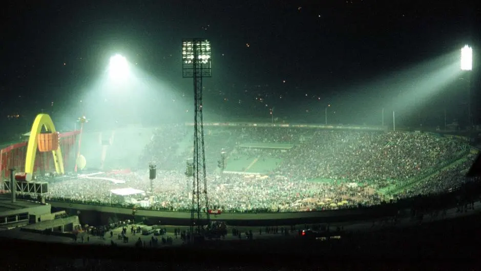 Noćni pogled s koncerta U2 PopMart pokazuje ulogu stadiona u kulturnom oporavku Sarajeva.