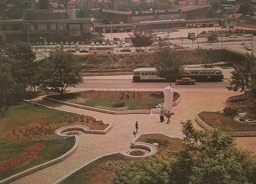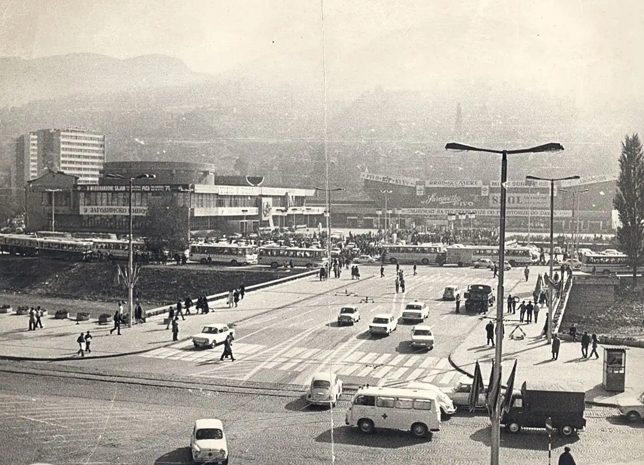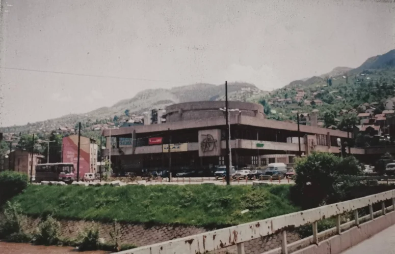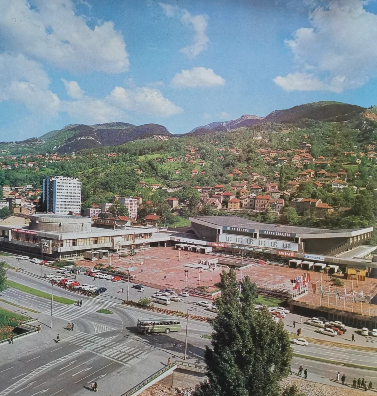Ova crno-bijela fotografija iz 1970-ih prikazuje pročelje kompleksa kao saobraćajno i društveno čvorište u centru Sarajeva.