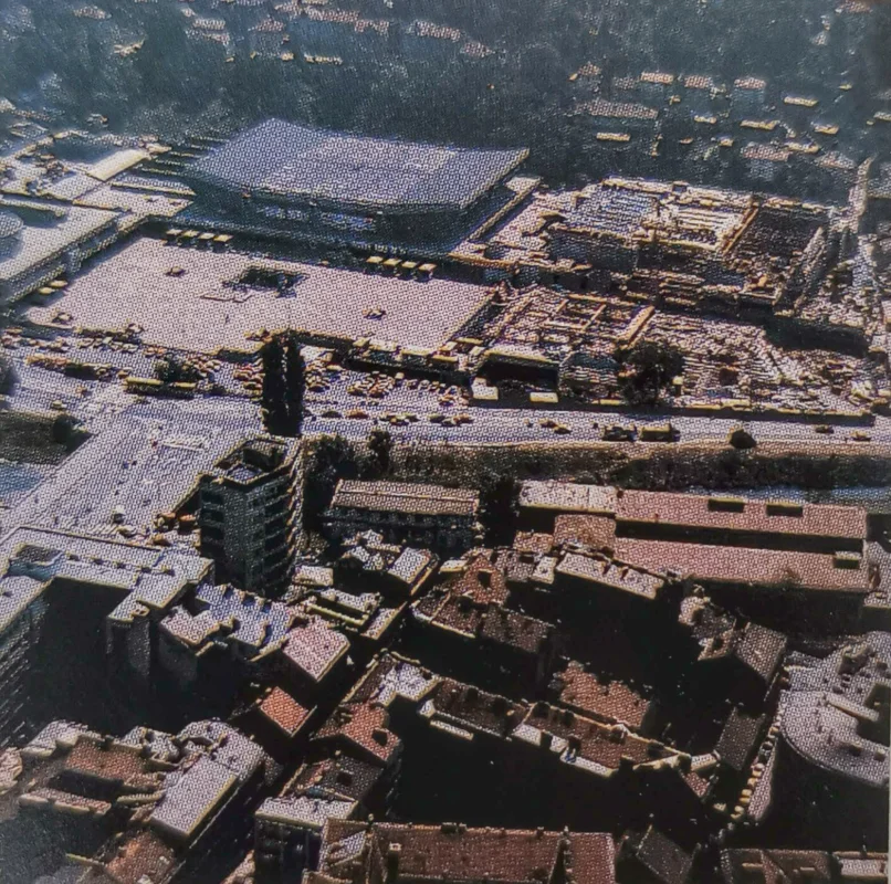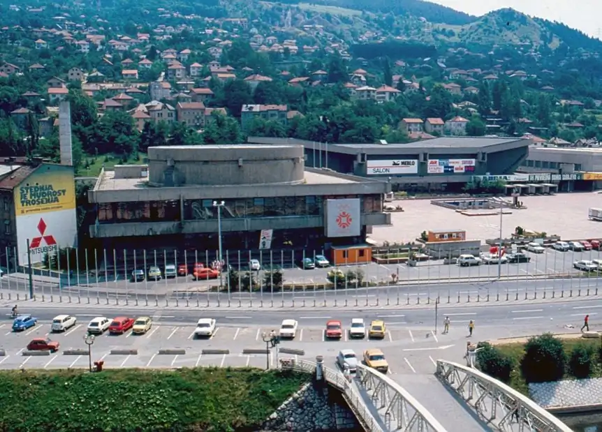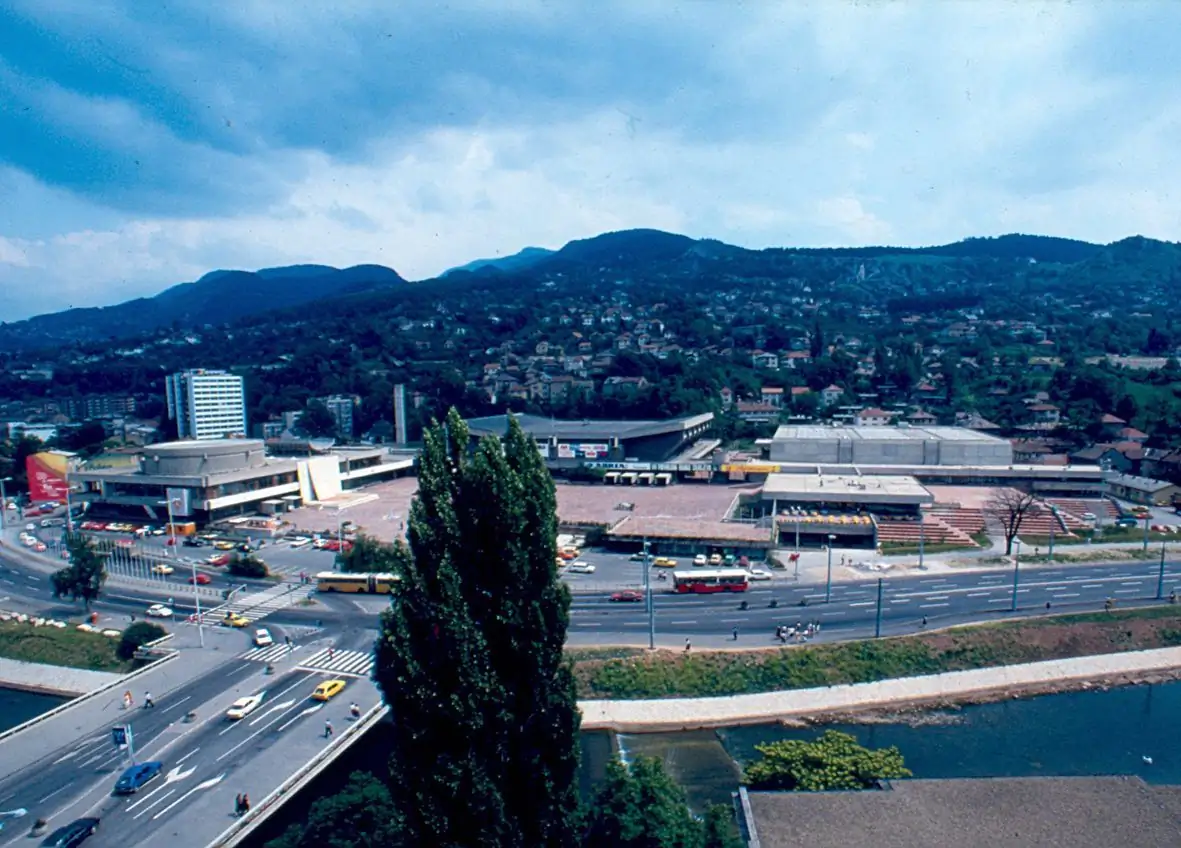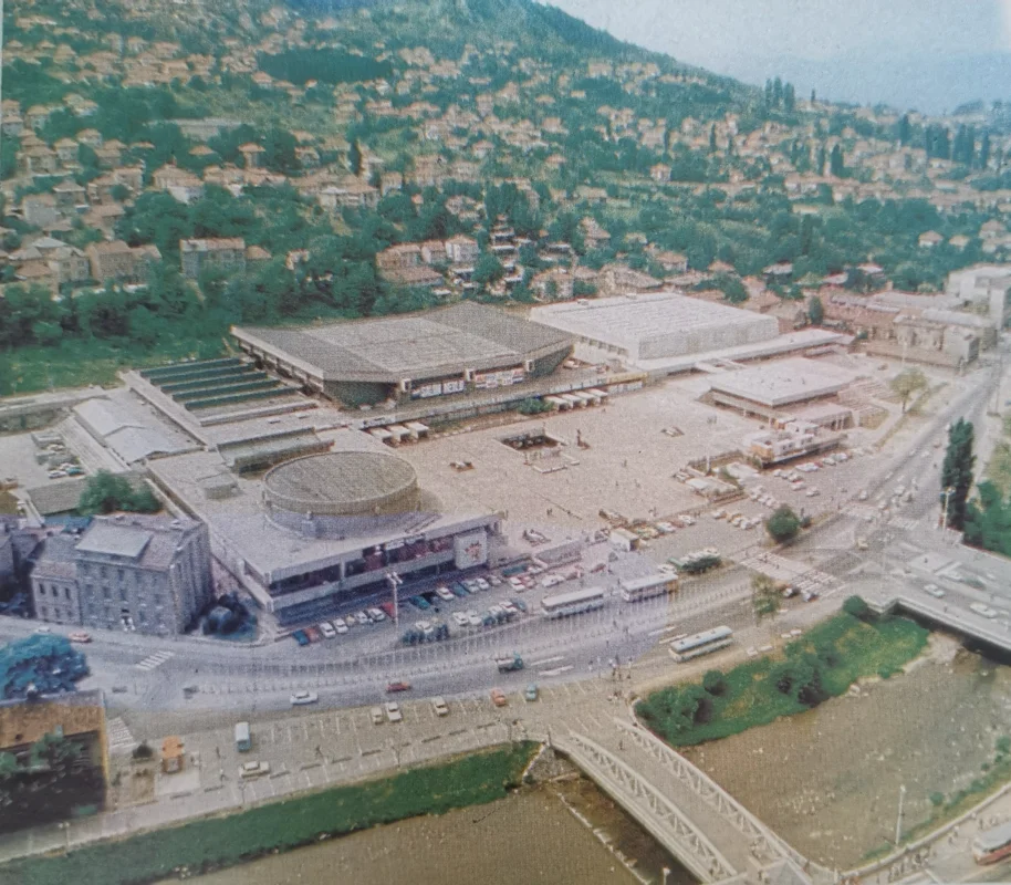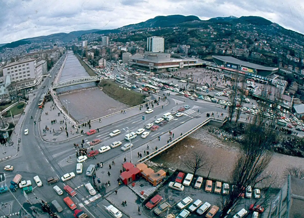Pogled iz 1985. na frekventnu raskrsnicu prikazuje postolimpijsku urbanu gustoću oko Skenderije i riječnih prelaza.
