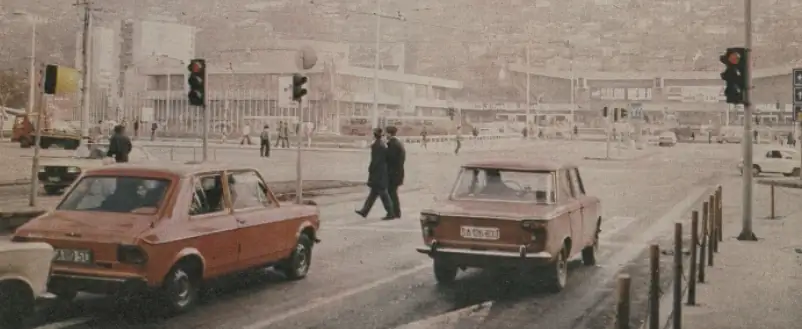 Kolor fotografija velike raskrsnice bilježi tok saobraćaja i pješaka ispred niske, horizontalne mase Skenderije.