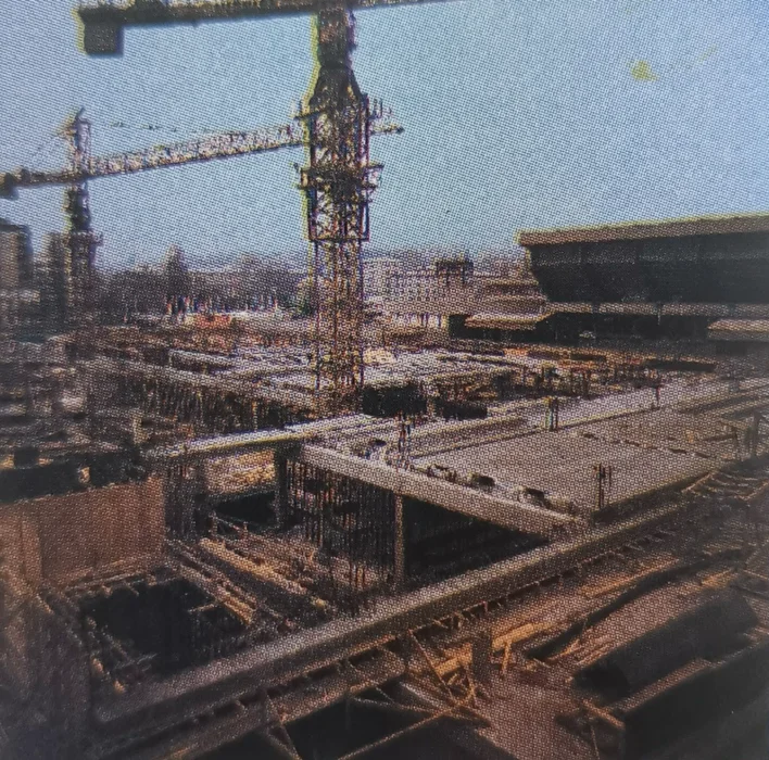Gradilište Ledene dvorane prikazuje rad kranova i ploča tokom velikog proširenja kojim je nastala Skenderija II.