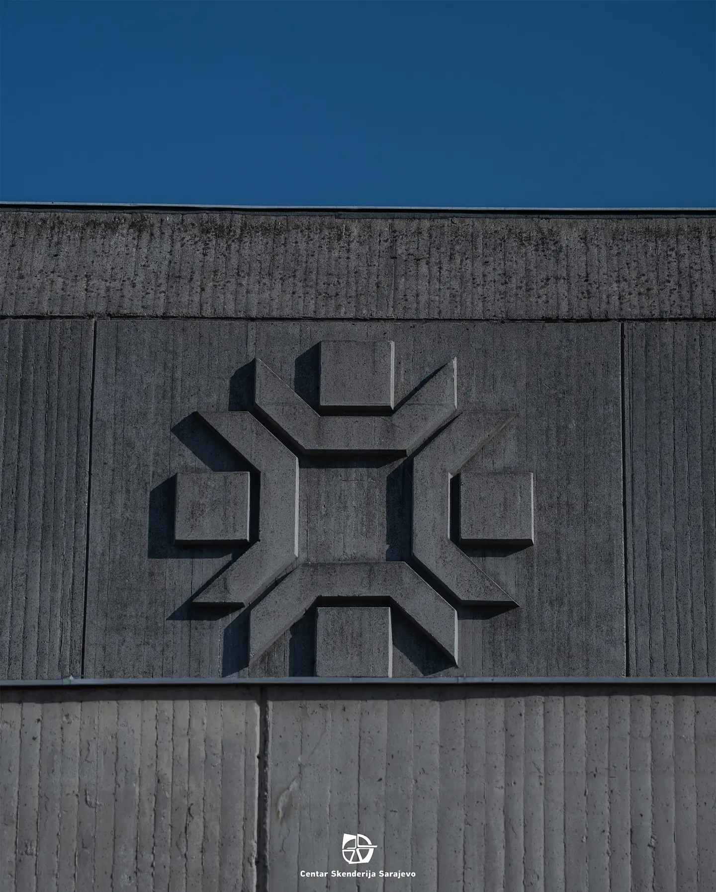 Krupni plan betonskog reljefa prikazuje urezani geometrijski znak ugrađen u ogoljene fasadne panele.