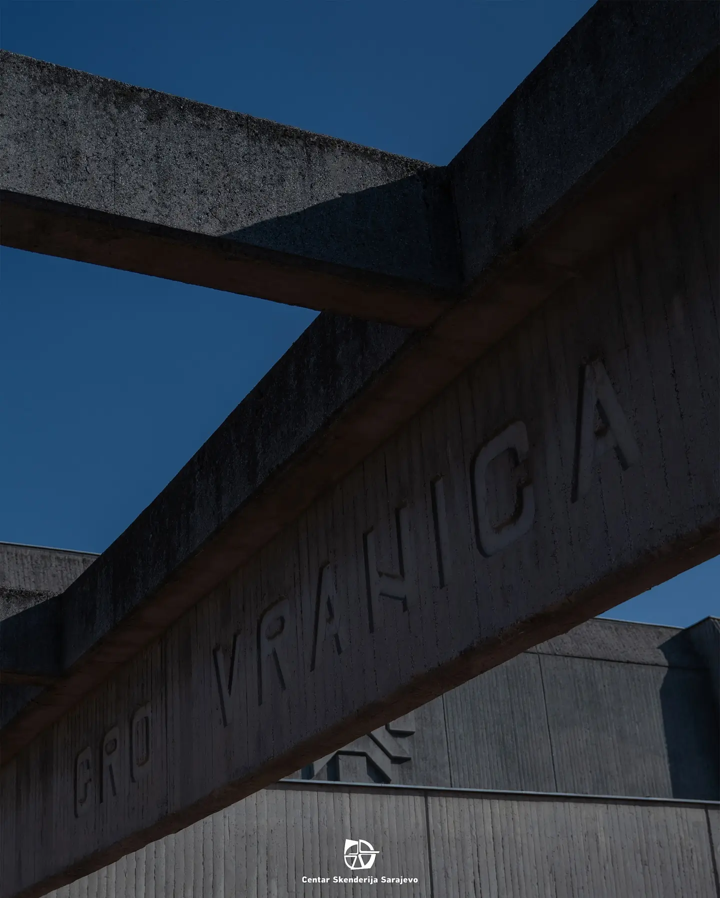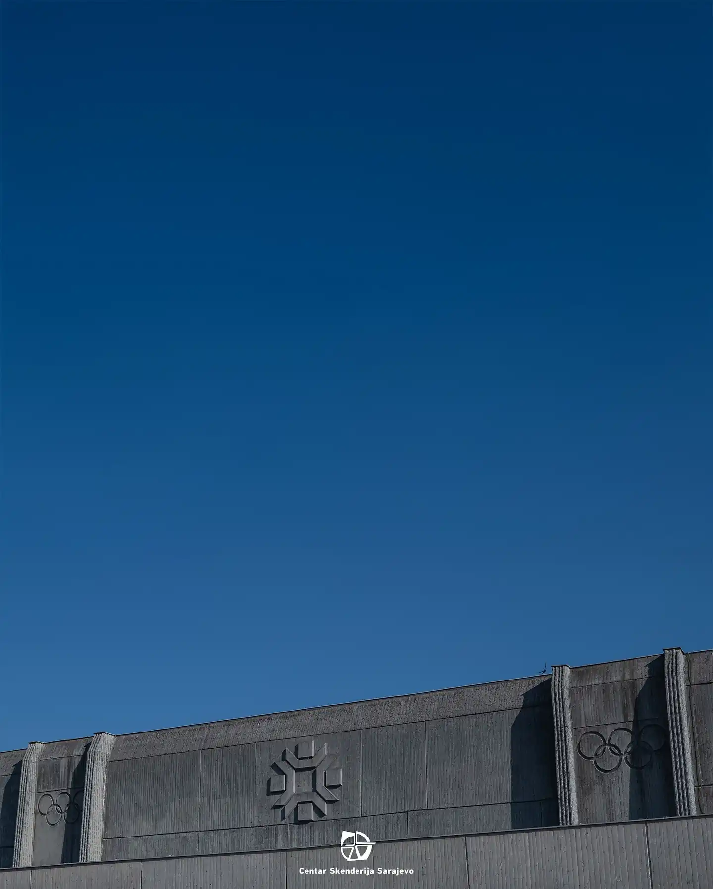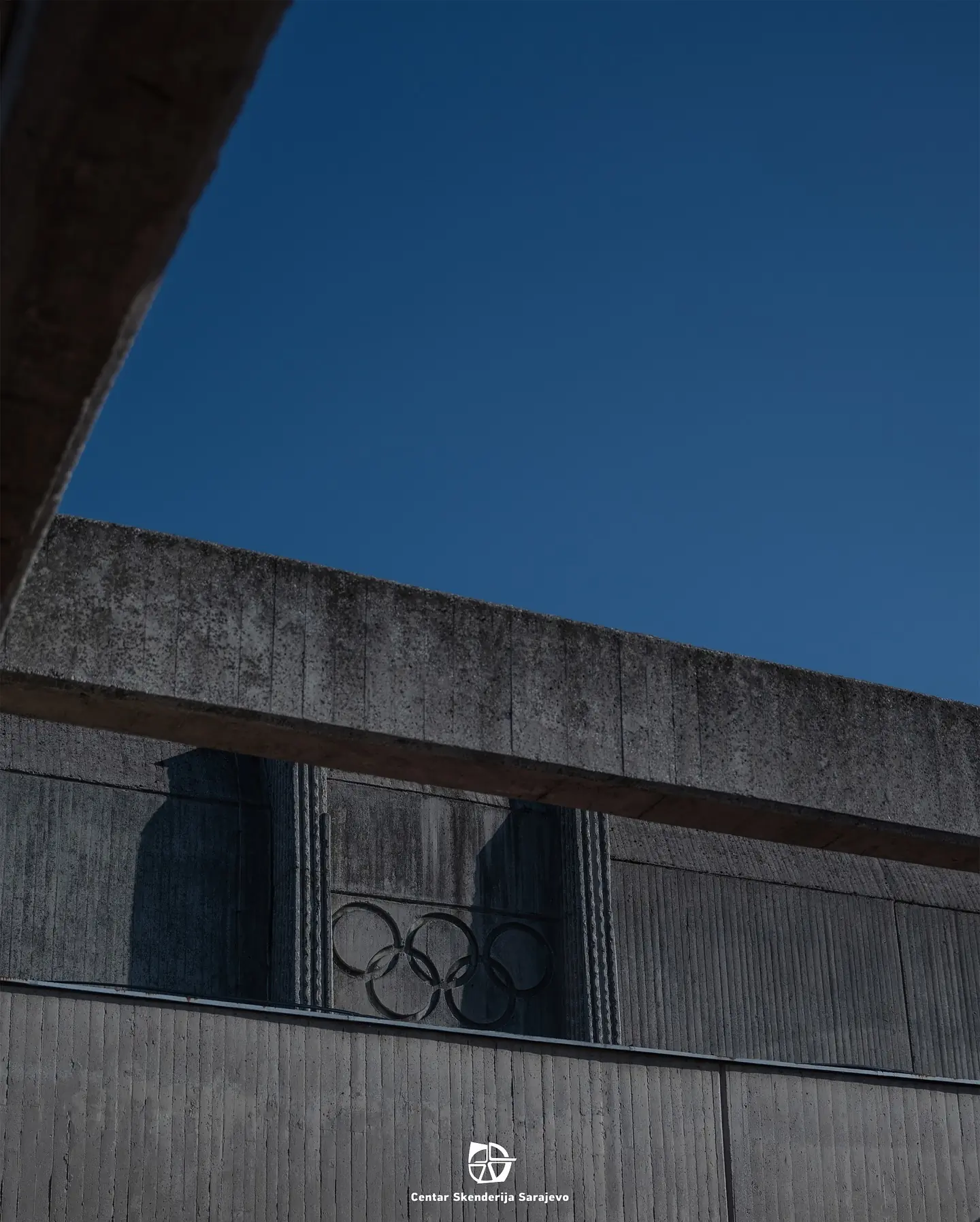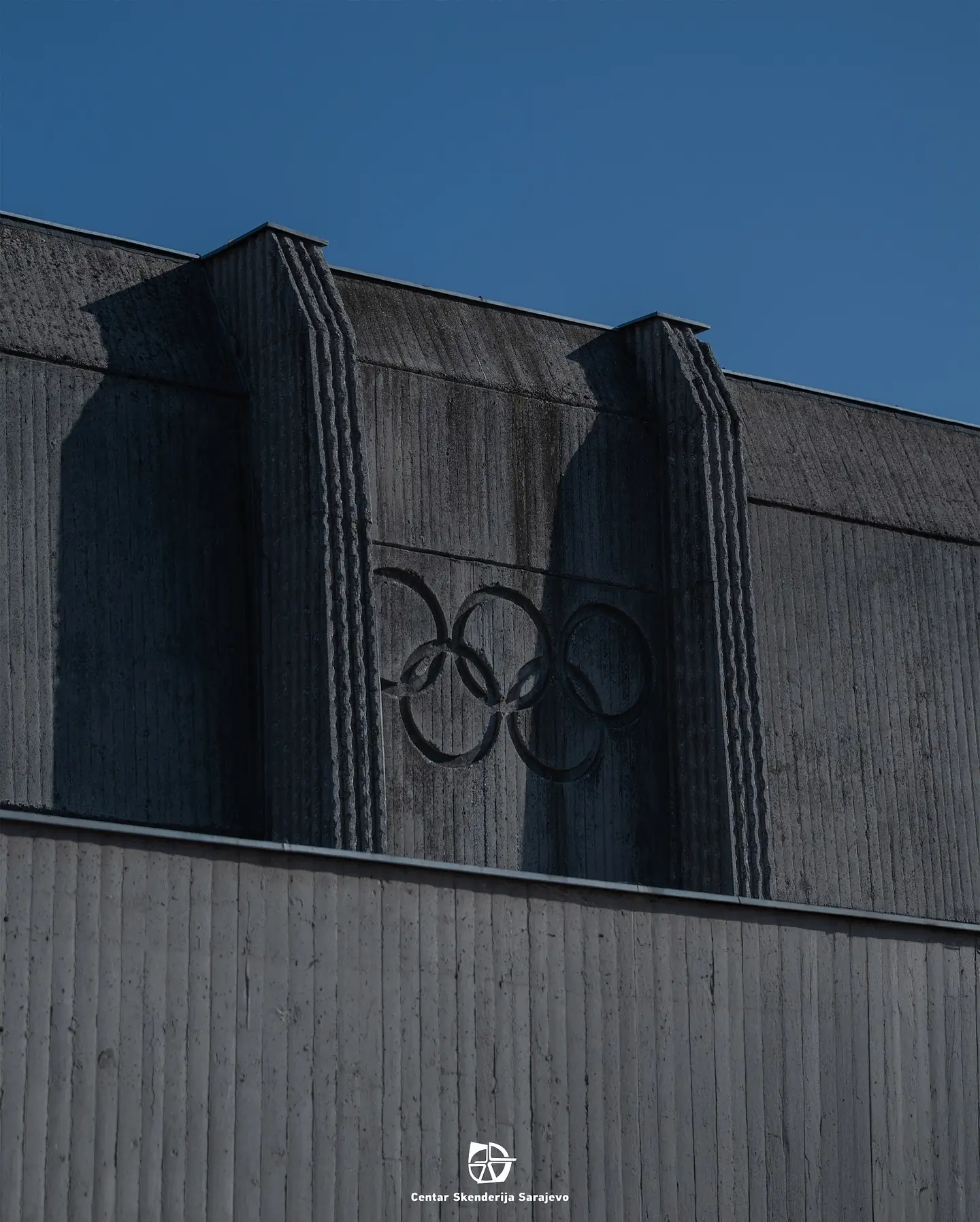 Reljef olimpijskih krugova prikazan je u sjeni, s istrošenim motivom uklopljenim u vertikalna betonska rebra.