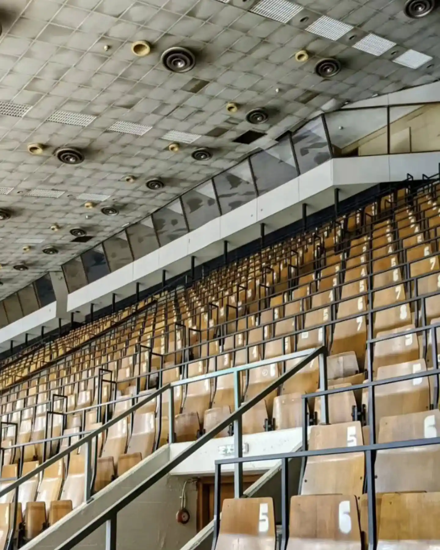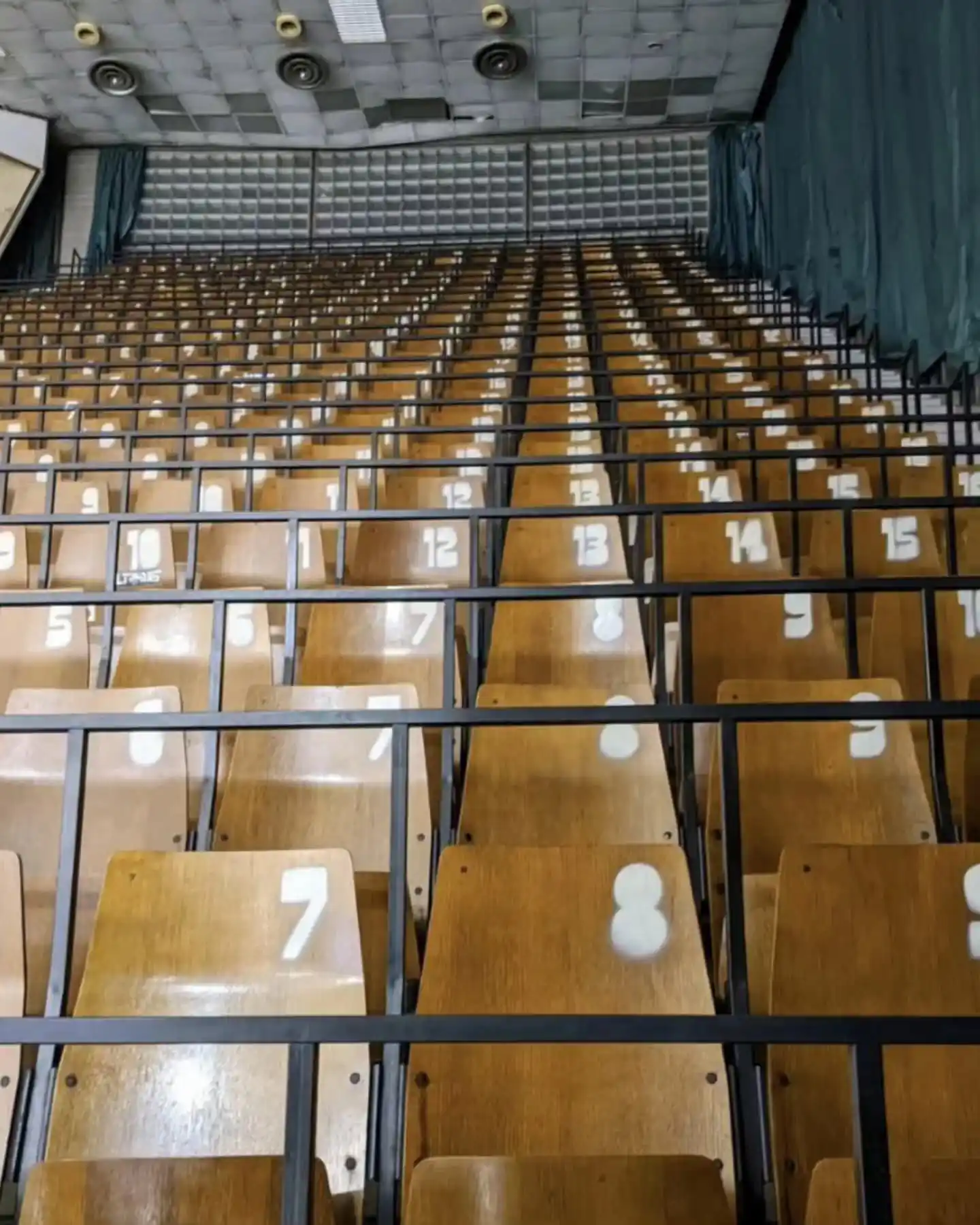 Pogled sprijeda na numerisane redove ističe očuvane drvene tribine i izvornu geometriju dvorane.