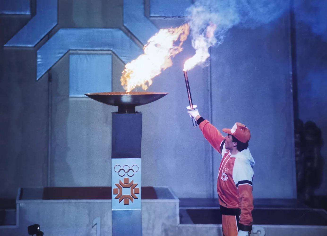 Prizor s plamenom na pozornici Skenderije bilježi olimpijsku baklju i plamenik povezane s ceremonijalnim programom.