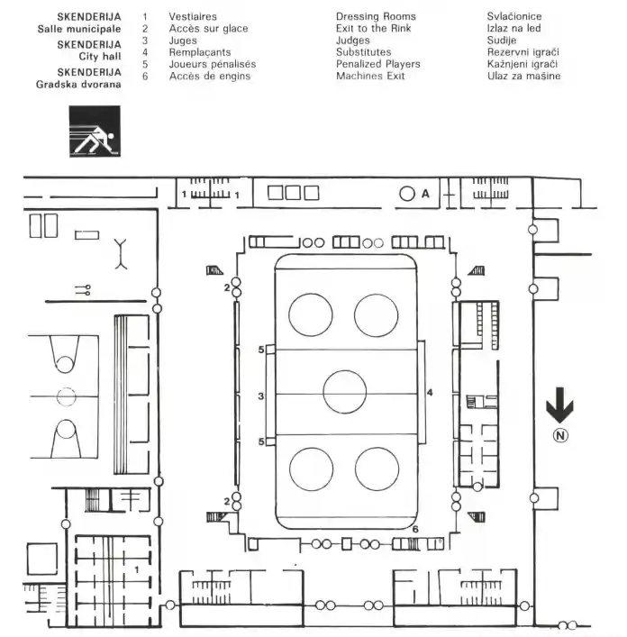 Ovaj tehnički tlocrt dvorane za hokej prikazuje prilaze za sportiste, zvaničnike i servisne službe.