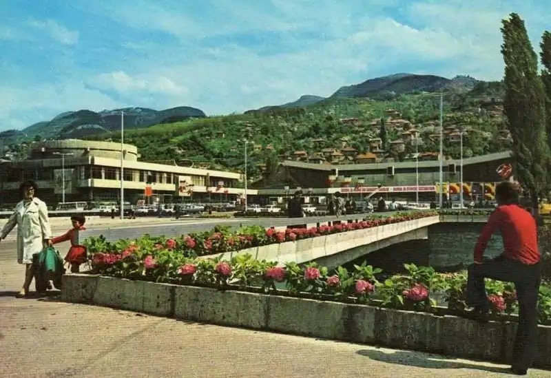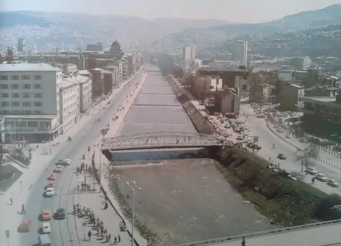 Ovaj pogled na riječnu obalu iz 1970-ih prati osu Miljacke sa Skenderijom uklopljenom u središnji gradski pojas.