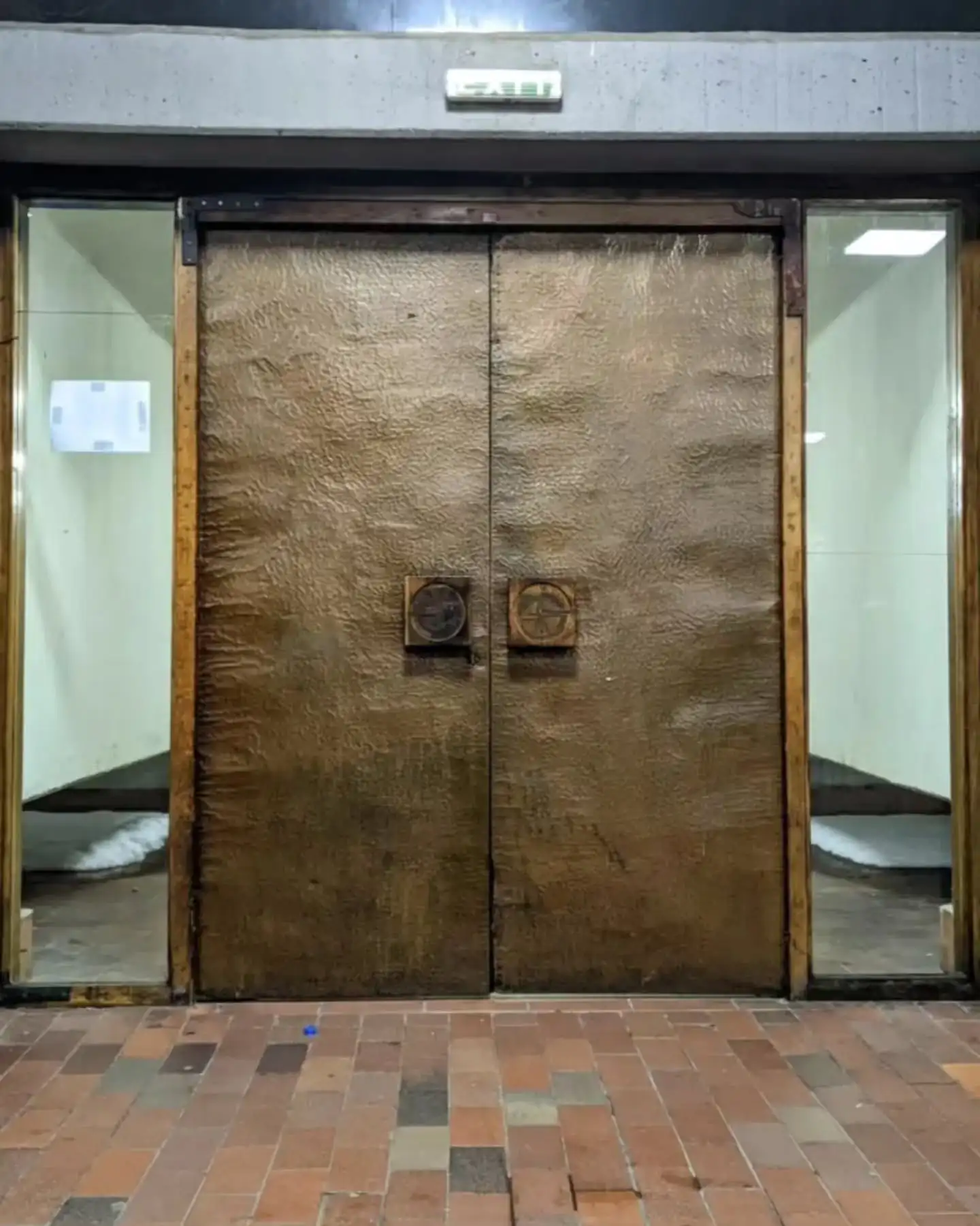 Masivna bronzana unutrašnja vrata ističu monumentalni ulazni detalj unutar komunikacijskog jezgra.