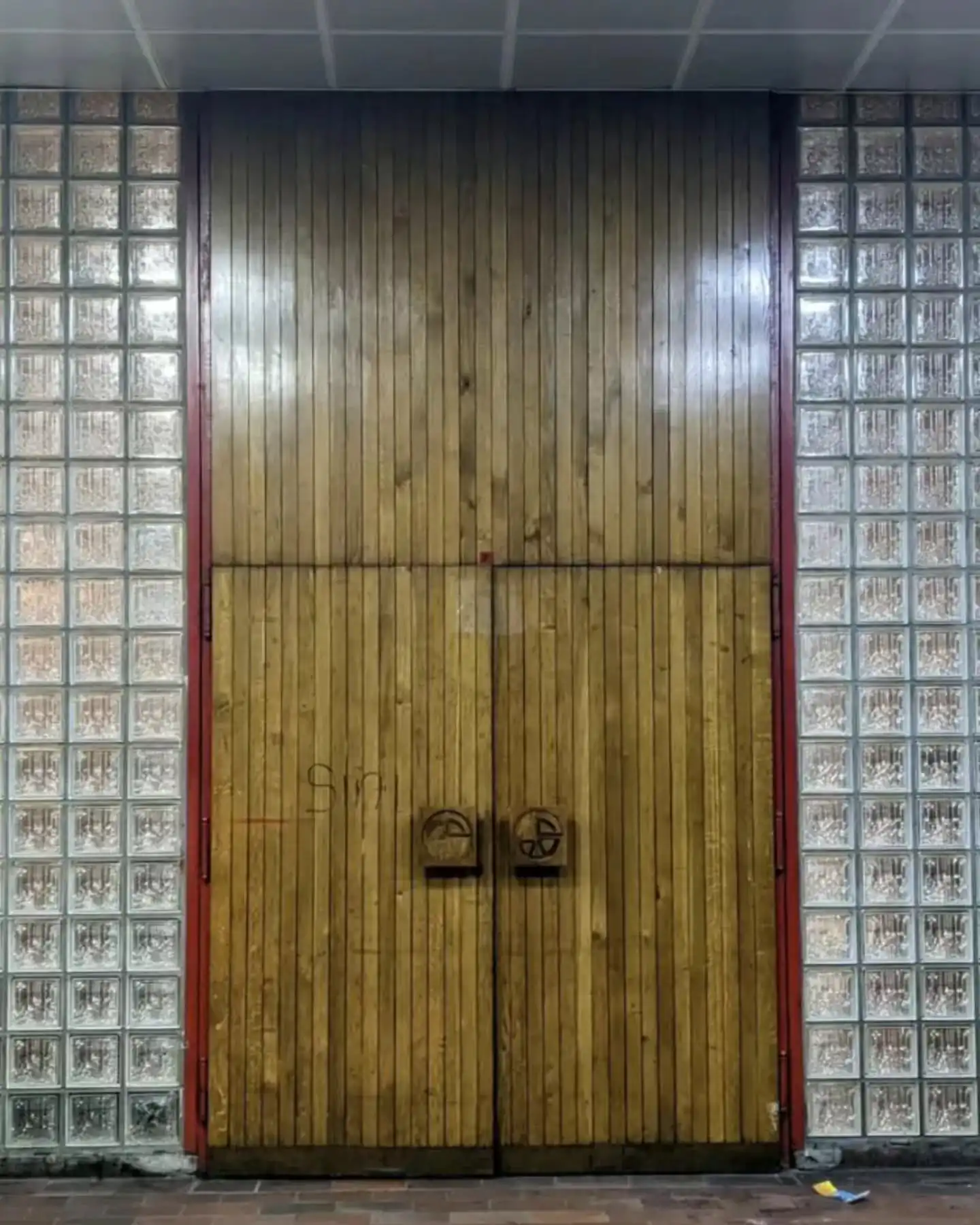 Drvena pregrada i zid od staklenih prizmi pokazuju materijalni jezik karakterističan za kasnomodernistički enterijer Skenderije.