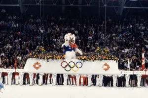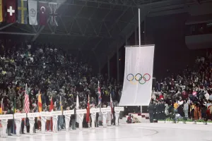 On the evening of February 19, 1984, the Zetra Olympic Hall filled with 8,500 people for the Closing Ceremony. It was an intimate, spontaneous affair. Following a parade of athletes from a record 49 nations, the anthems of Greece, Yugoslavia, and Canada—the next host—were played. IOC President Juan Antonio Samaranch officially closed the Games. As eight cadets carried the Olympic flag from the hall, the flame that had burned brightly over the city was extinguished. The ceremony ended not with solemnity, but with a joyful vision of the future. A children's skating ensemble danced to the song "It was beautiful in Sarajevo - see you in Calgary," as Sarajevo’s mascot Vučko shared the ice with Calgary's polar bear mascot.