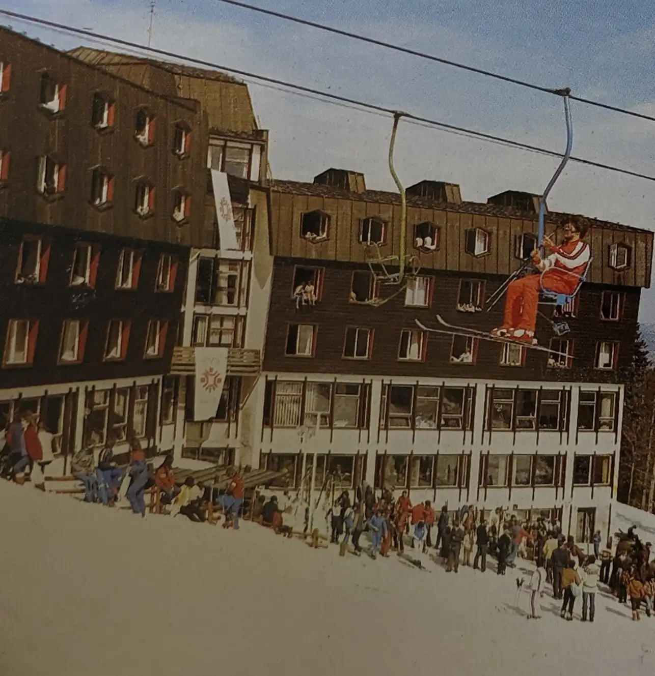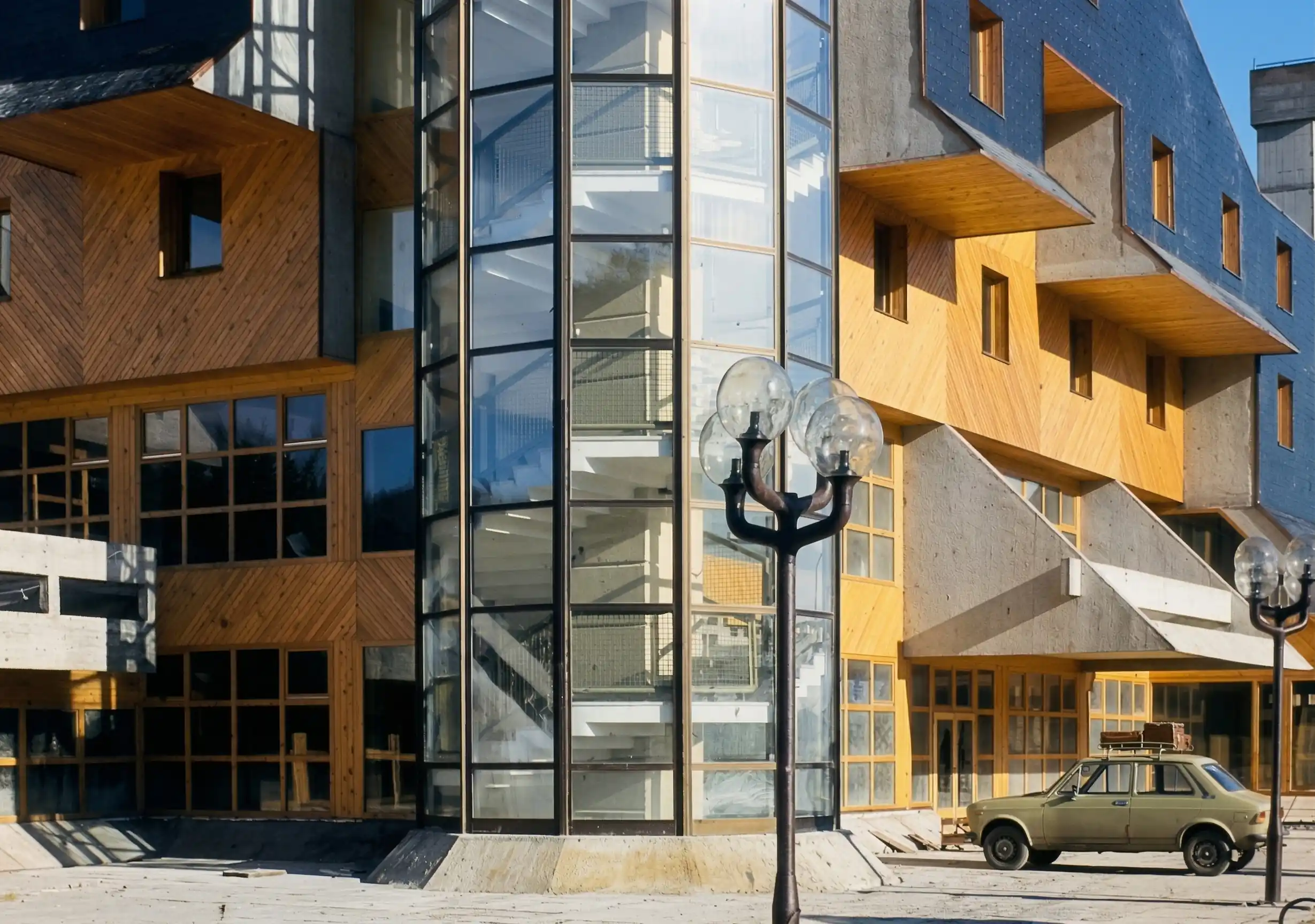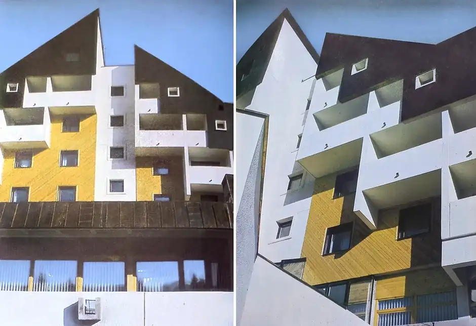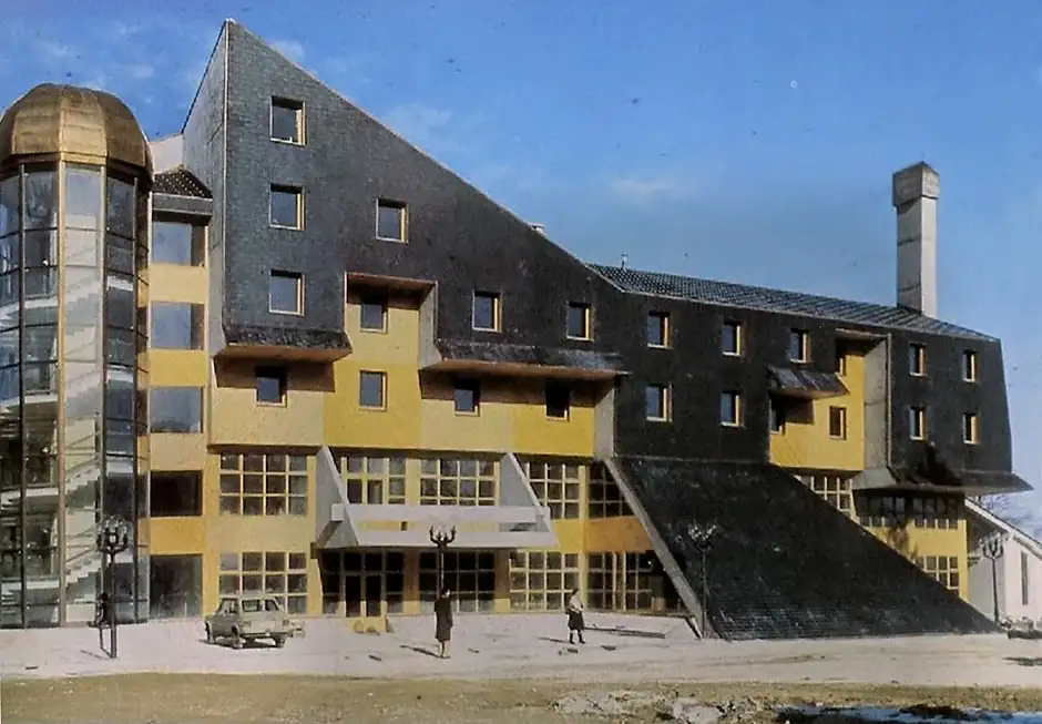 The architectural anchor of the Bjelašnica area was Hotel Famos. Commissioned in 1980 and designed by Zenica-born architects Slobodan and Duška Jovandić, this 186-bed modernist ski lodge was completed in 1983. Its design was dominated by an intricately sloping roofline that transitioned into squared, overhanging cutouts clad in diagonal yellow pine wood, a unifying geometric feature seen across other Olympic sites like Hotel Borik and the Hotel Igman.