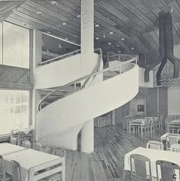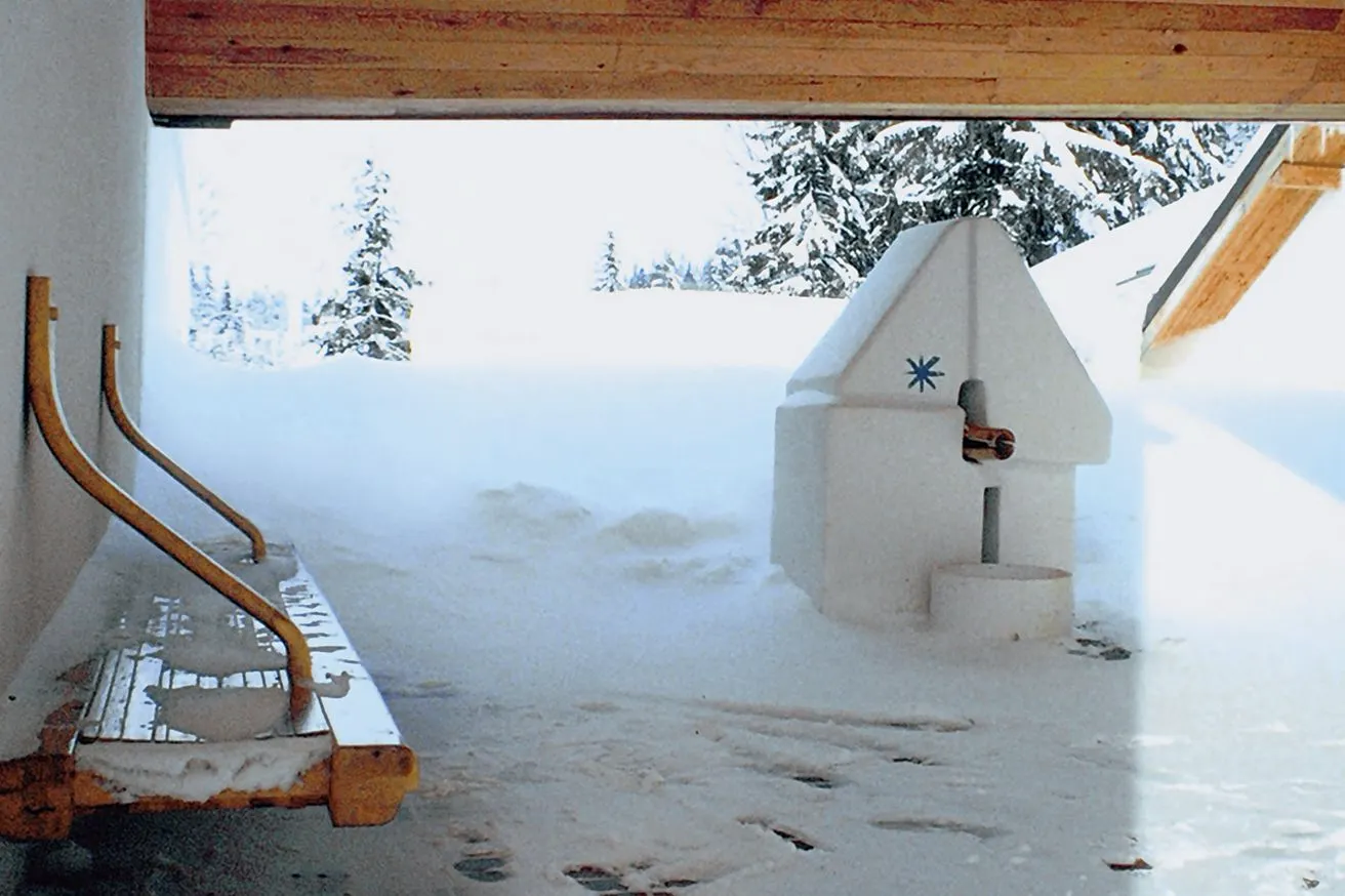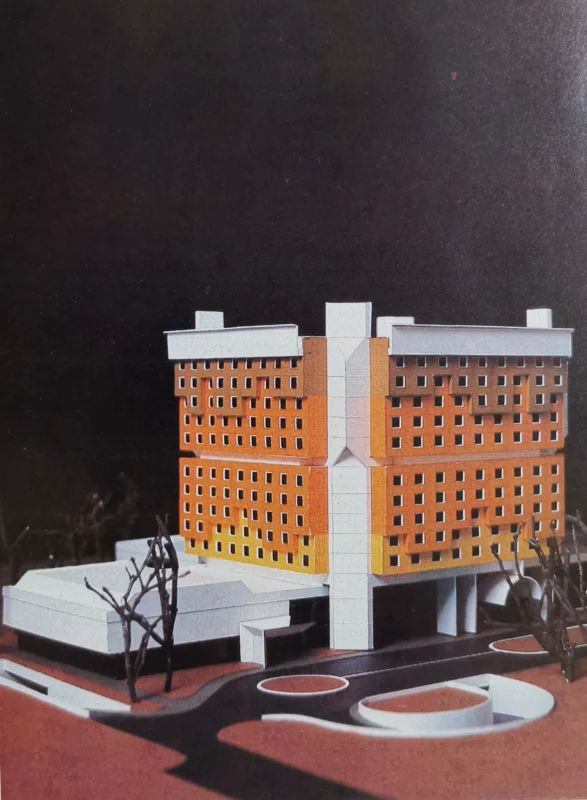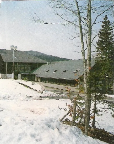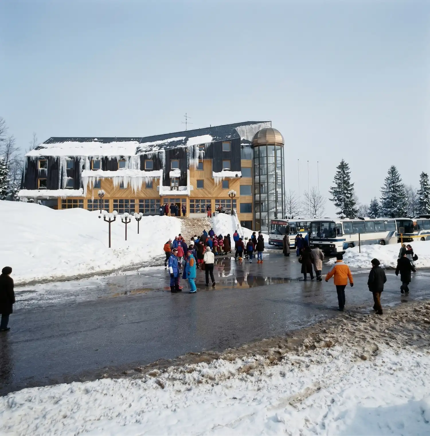 The architectural anchor of the Bjelašnica area was Hotel Famos. Commissioned in 1980 and designed by Zenica-born architects Slobodan and Duška Jovandić, this 186-bed modernist ski lodge was completed in 1983. Its design was dominated by an intricately sloping roofline that transitioned into squared, overhanging cutouts clad in diagonal yellow pine wood, a unifying geometric feature seen across other Olympic sites like Hotel Borik and the Hotel Igman.