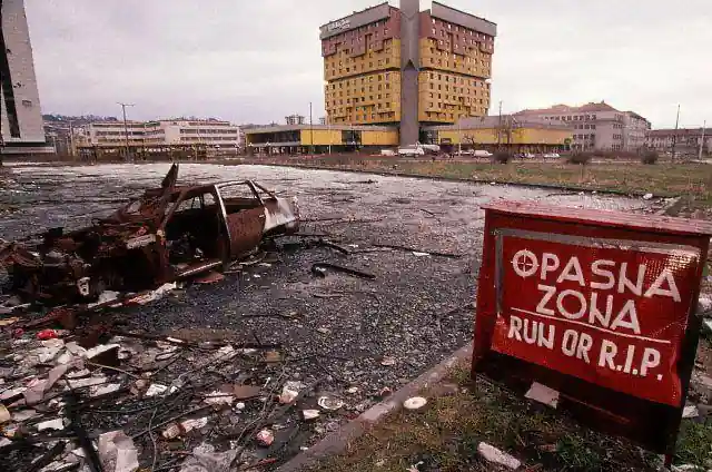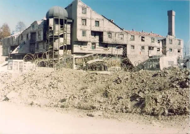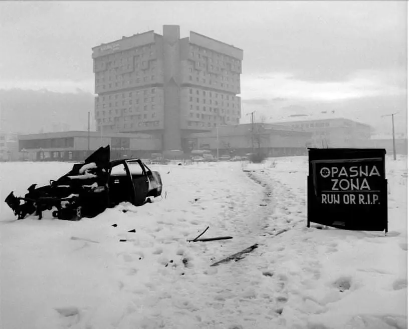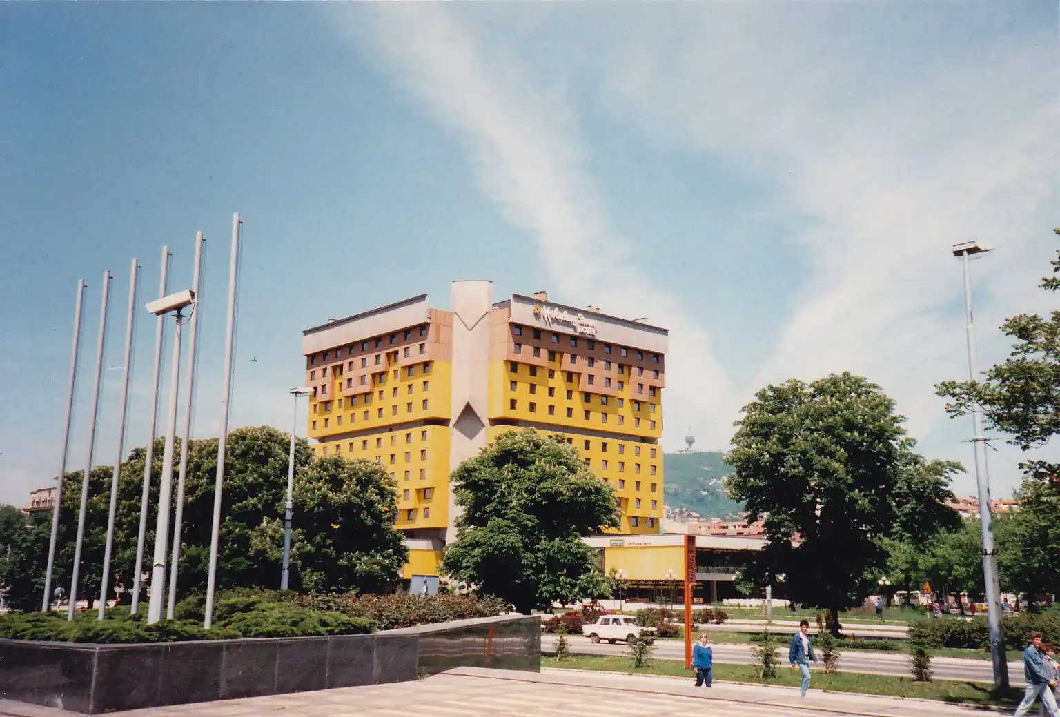 The hotel's festive origins took a dark turn in 1992 when it became the heavily armed headquarters for Radovan Karadžić’s Serbian Democratic Party (SDS). The Bosnian War effectively ignited at its doorstep that April when SDS snipers positioned in the hotel's upper floors opened fire on thousands of unarmed peace demonstrators below, prompting outraged protesters and Bosnian special police to storm the building as the political leadership fled.