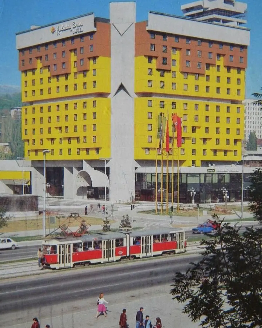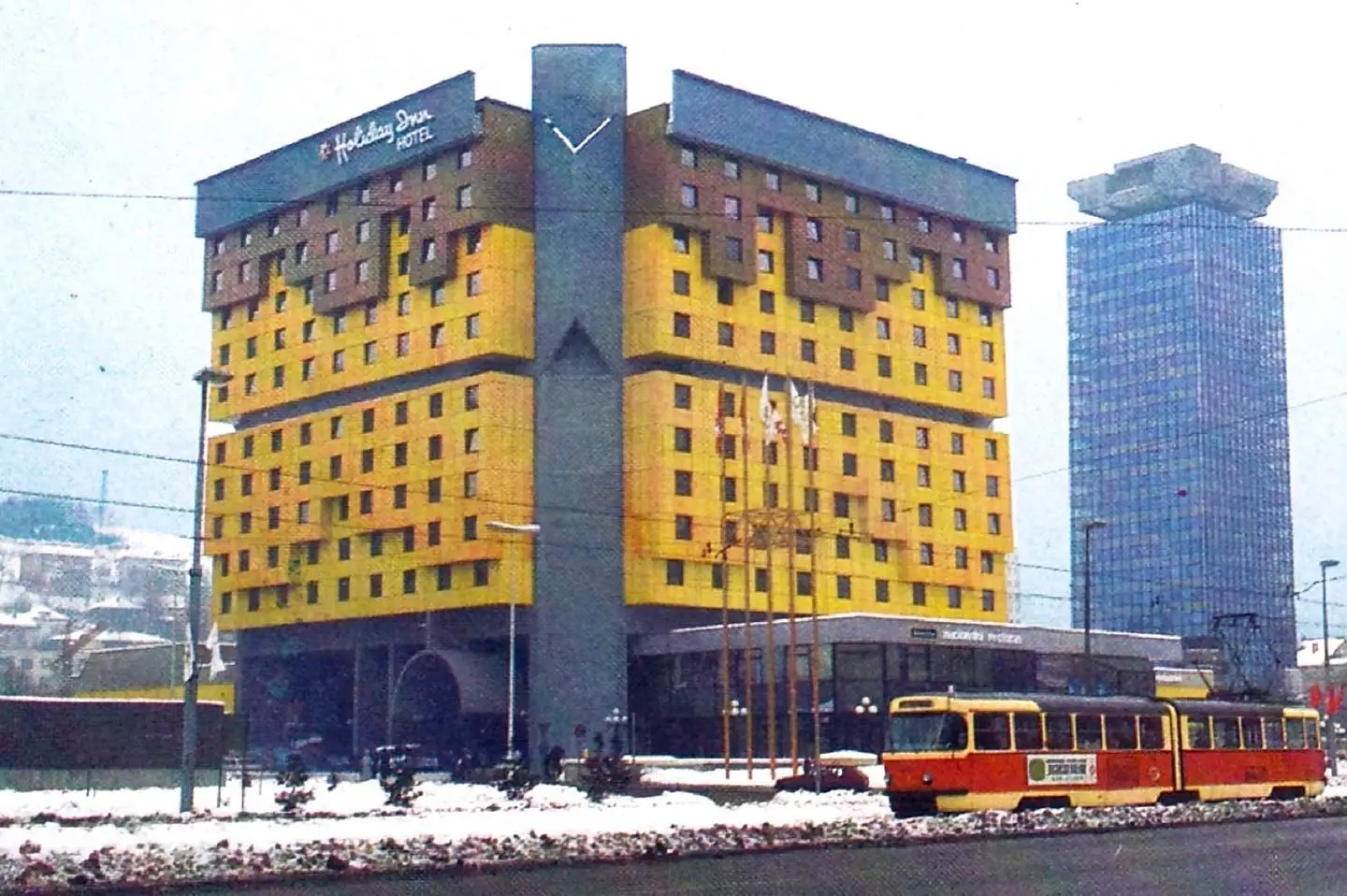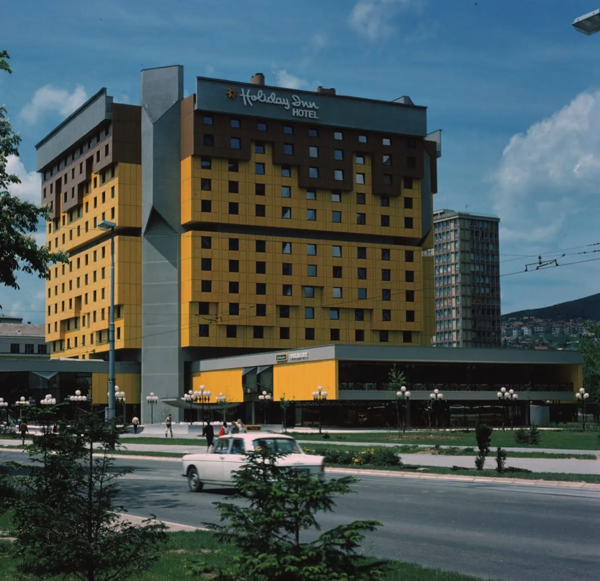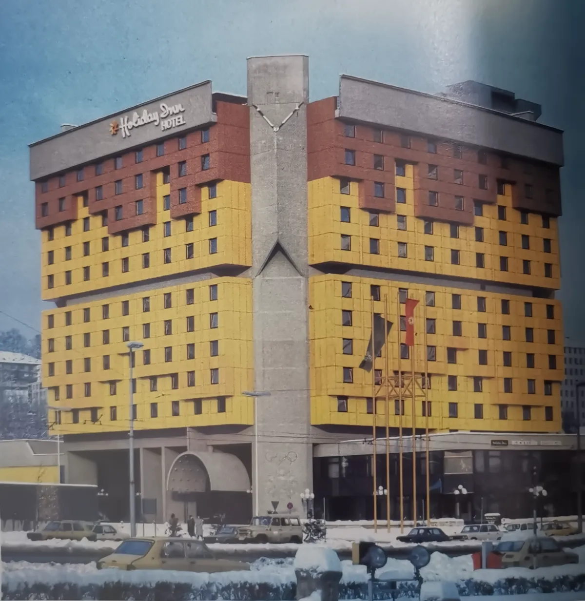 Initially planned as a Hilton for the International Olympic Committee (IOC), organizers ultimately chose the more affordable Holiday Inn brand. Designed by renowned Bosnian architect Ivan Štraus and built between 1981 and 1983 in the Marijin Dvor neighborhood, the 336-room (714-bed) hotel is a striking ten-story cube clad in bright yellow aluminum. The hotel officially opened on October 6, 1983, with IOC President Juan Antonio Samaranch as its first guest. Samaranch occupied the "Presidential Suite" on the fifth floor (room 530), later expressing his delight at the hotel as a prime example of Sarajevo's successful preparations.