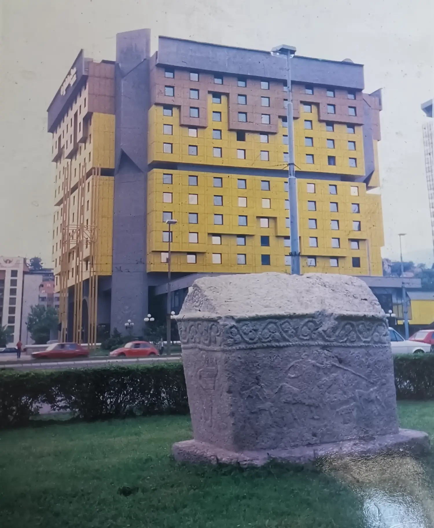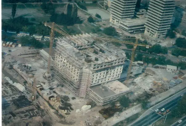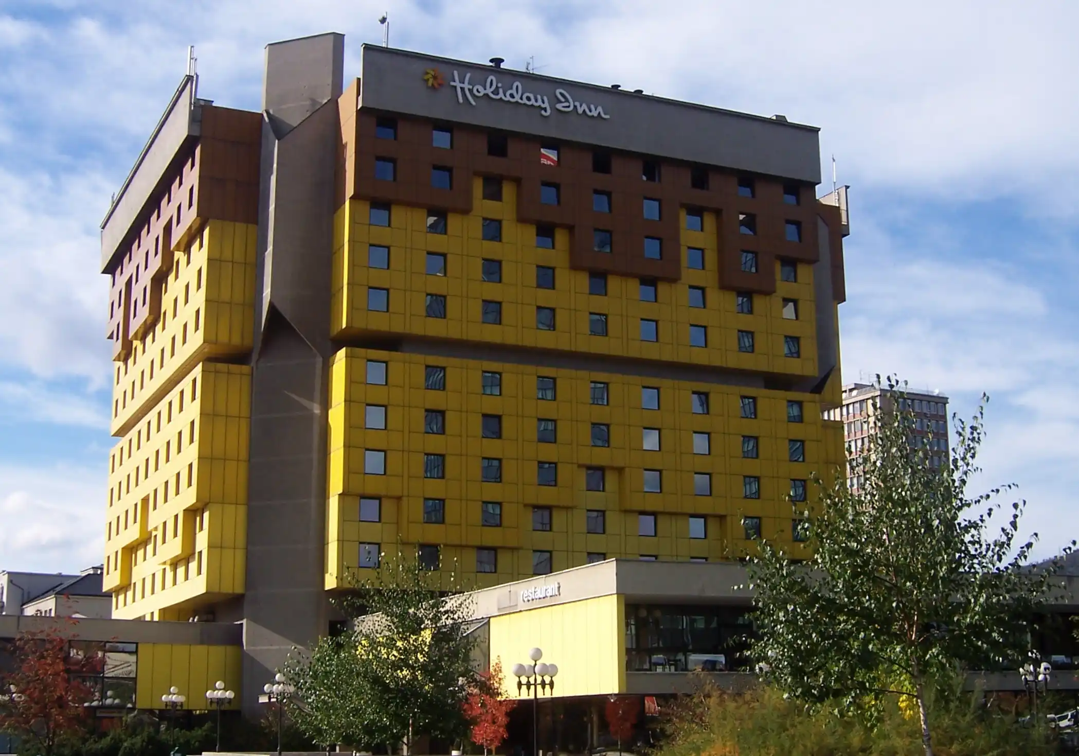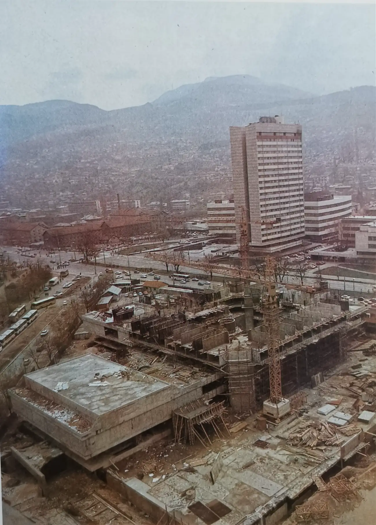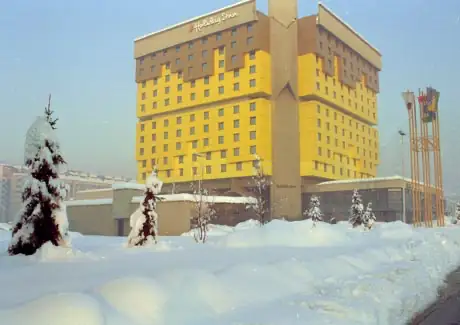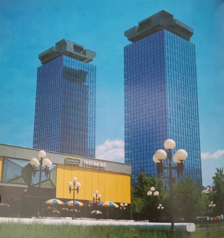 Initially planned as a Hilton for the International Olympic Committee (IOC), organizers ultimately chose the more affordable Holiday Inn brand. Designed by renowned Bosnian architect Ivan Štraus and built between 1981 and 1983 in the Marijin Dvor neighborhood, the 336-room (714-bed) hotel is a striking ten-story cube clad in bright yellow aluminum. The hotel officially opened on October 6, 1983, with IOC President Juan Antonio Samaranch as its first guest. Samaranch occupied the "Presidential Suite" on the fifth floor (room 530), later expressing his delight at the hotel as a prime example of Sarajevo's successful preparations.