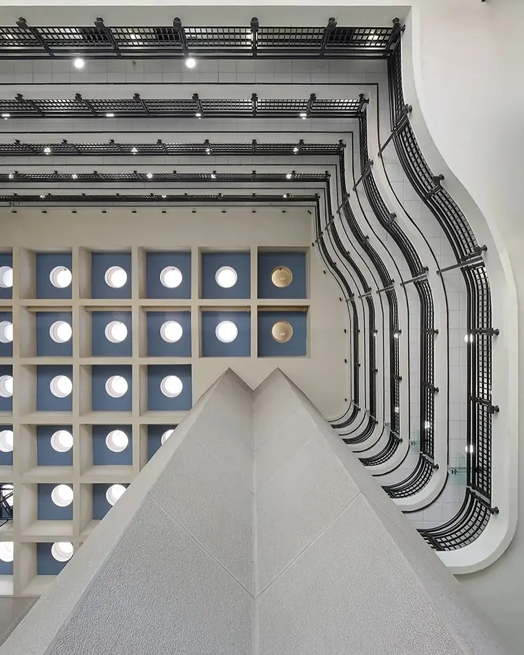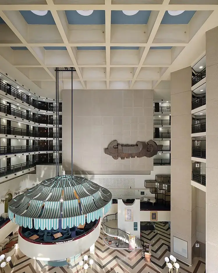Štraus envisioned the interior as an "indoor city" inspired by Sarajevo's traditional Ottoman-era Morića Han. Inside, a massive yellow "big top" parasol anchors the cavernous atrium, offering a whimsical nod to the site's Austro-Hungarian history as Cirkus plac (Circus Square). The bold aesthetic continues throughout the space with zig-zag marble floors, lurid purple carpets, exposed brick walls, and reflective glass galleries that create an optical illusion of infinite space.