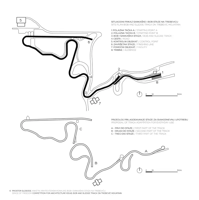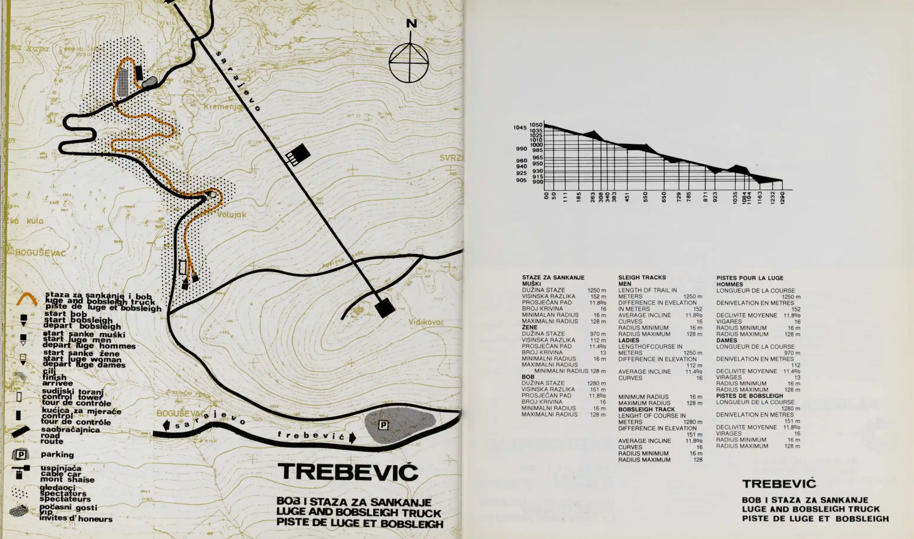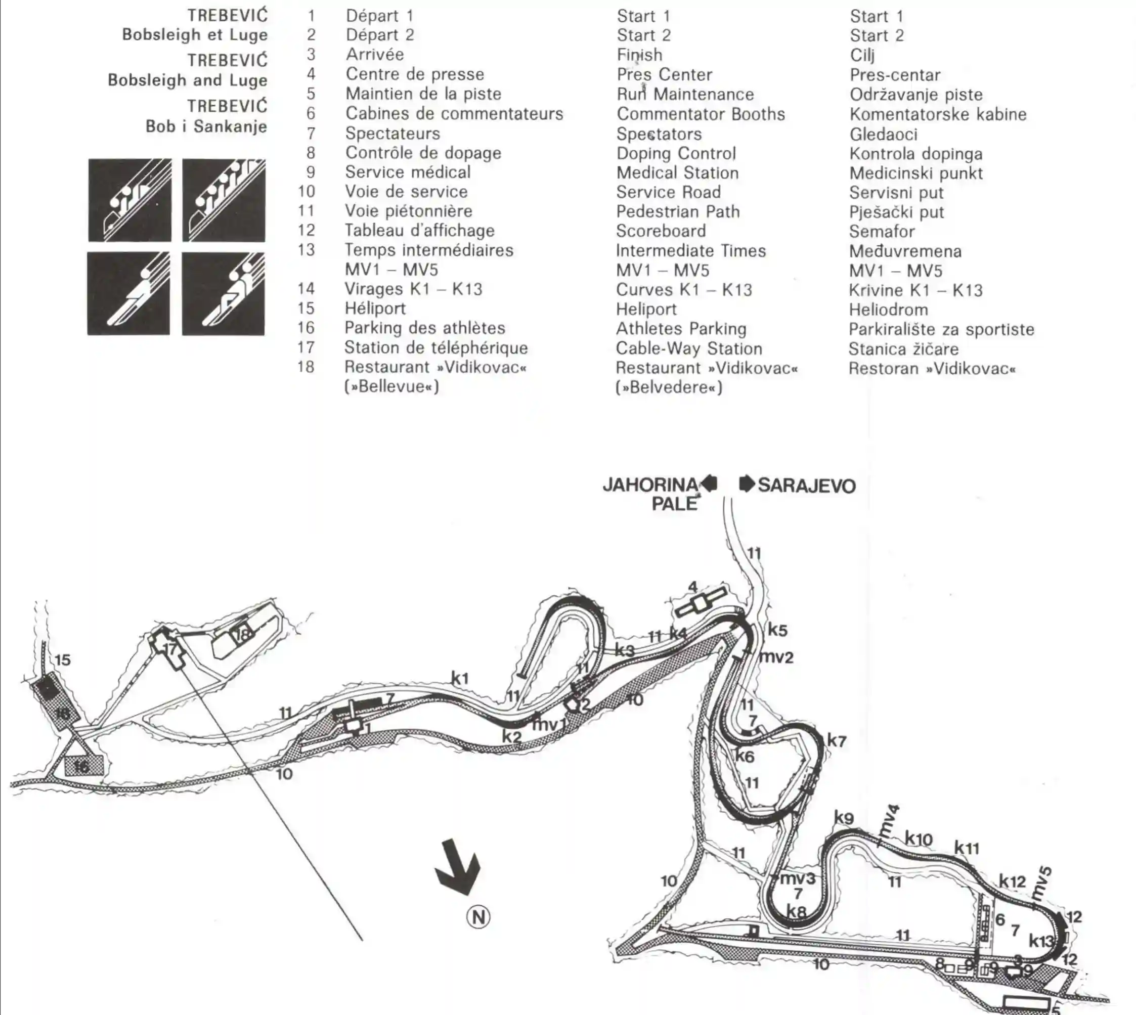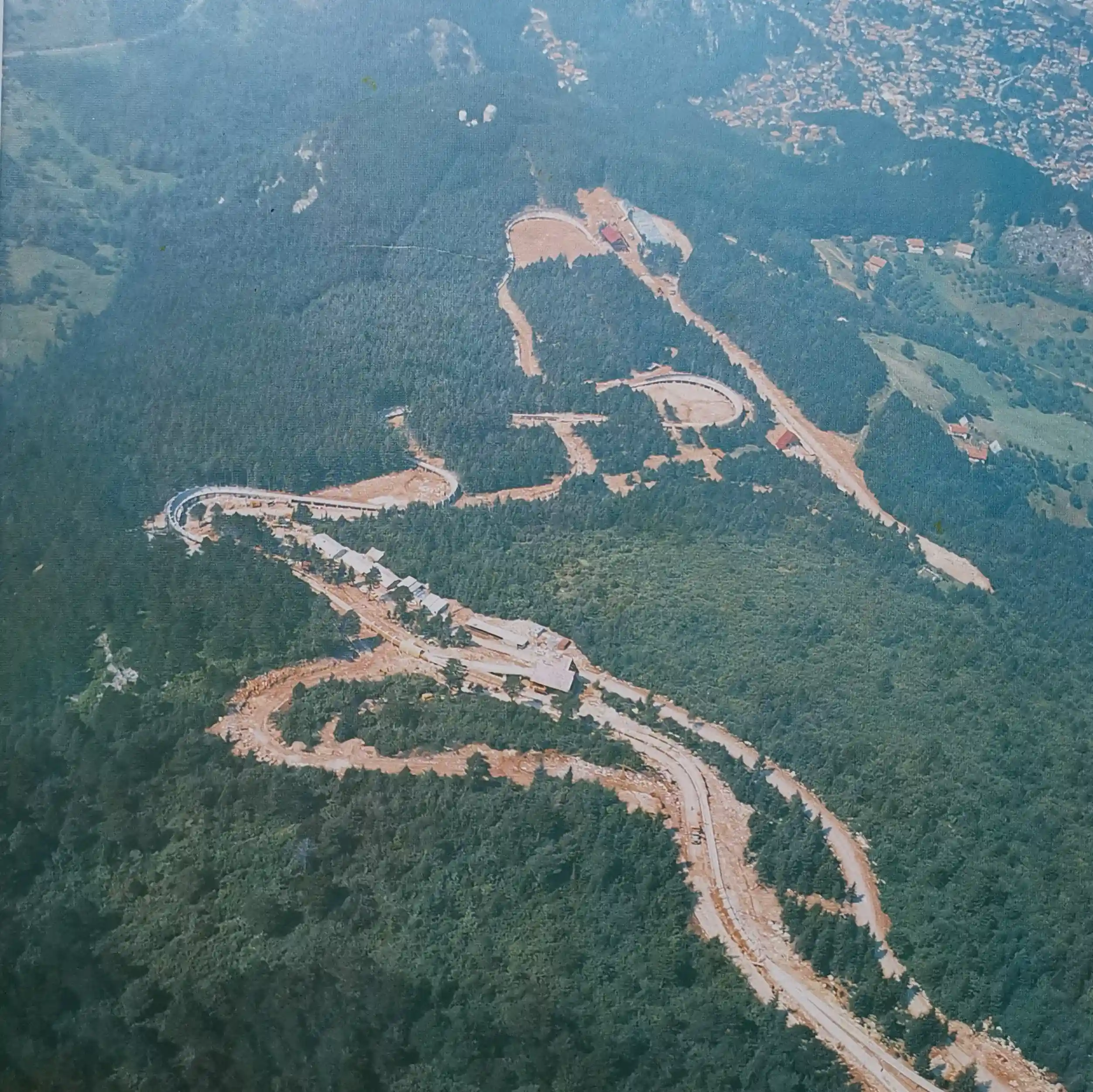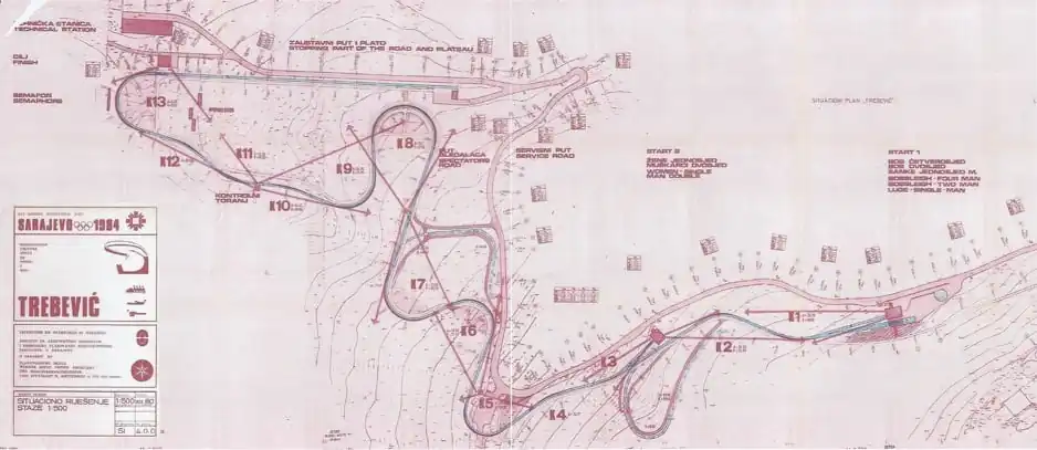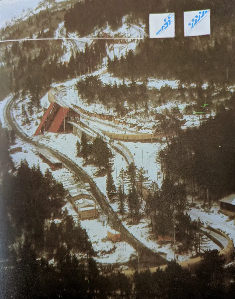 The 1984 venue footprint was defined by three major components: the ropeway corridor, the Olympic track zone, and the leisure areas. The ropeway (or cable railway) provided the primary link, carrying visitors from the neighborhood of Bistrik at 583 meters above sea level to the Vidikovac station at 1,160 meters. The Olympic track itself was situated between 982 and 1,110 meters, integrated into a 51-hectare complex that included the Finish House, multiple start facilities, and a dedicated press center located above Curve 5.